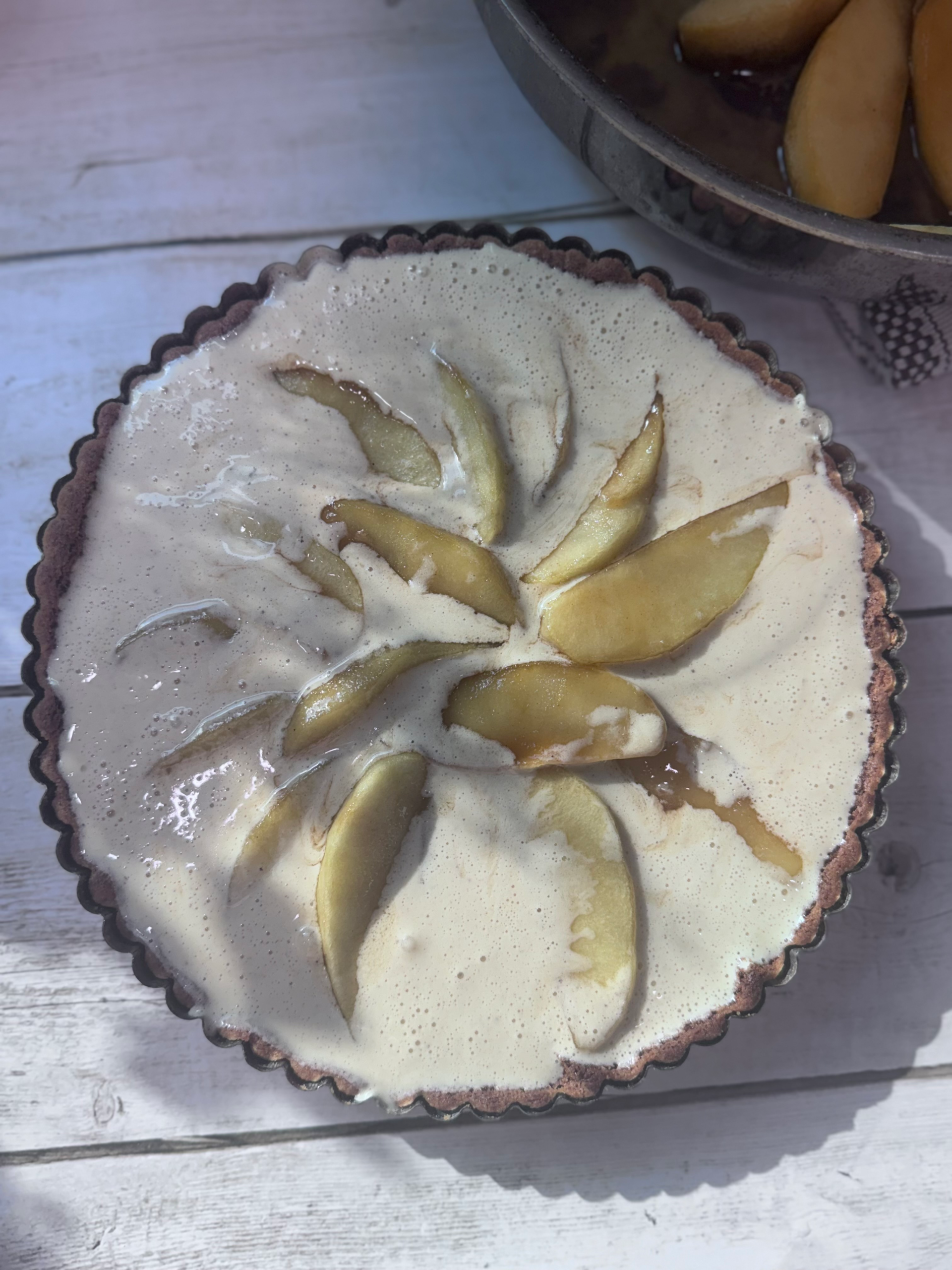Pour the custard into the shell and arrange the apples in a single layer of slightly overlapping circles. Bake the tart in the lower third of the oven for 45-50 minutes, until the custard is puffed and richly browned. Transfer to a rack and cool before serving.