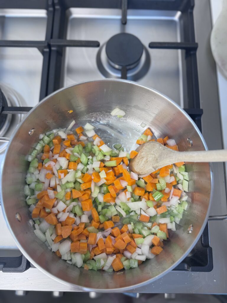 6 tbs butter, 1 cup onions, 1 cup carrots, 1 cup celery, 4 cloves garlic