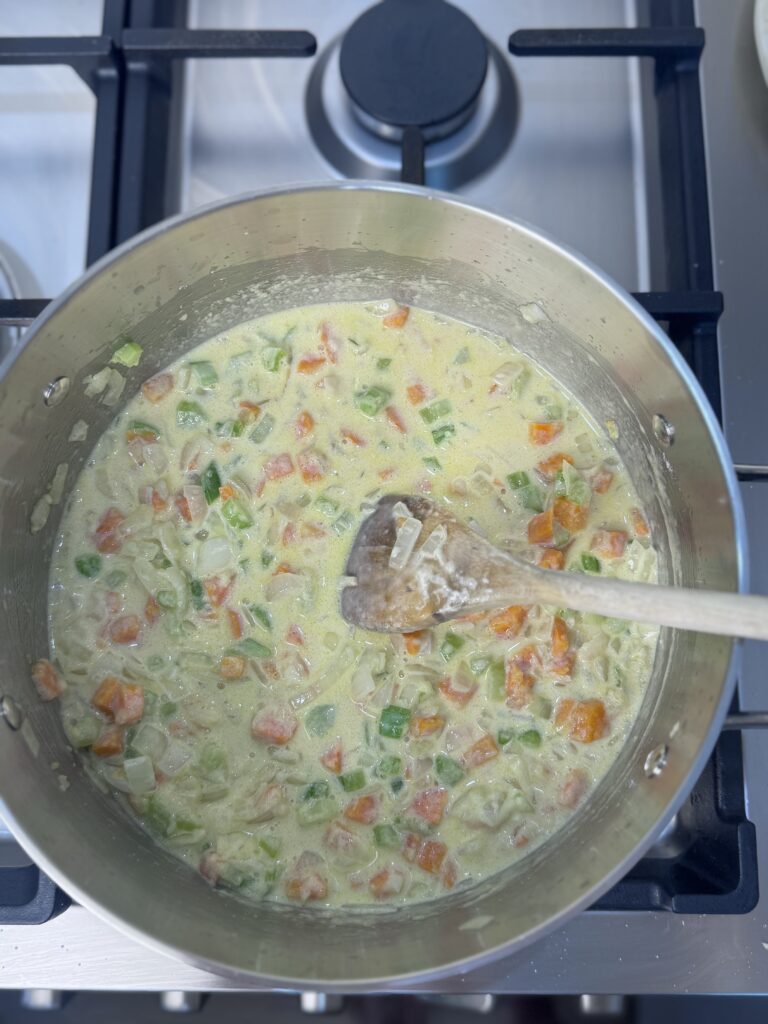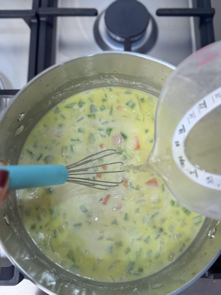 Add the flour and stir constantly for 1 minute to coat the veggies. Slowly pour in the evaporated milk and stir to combine. Add your leftover broth gradually, whisking constantly to avoid lumps.