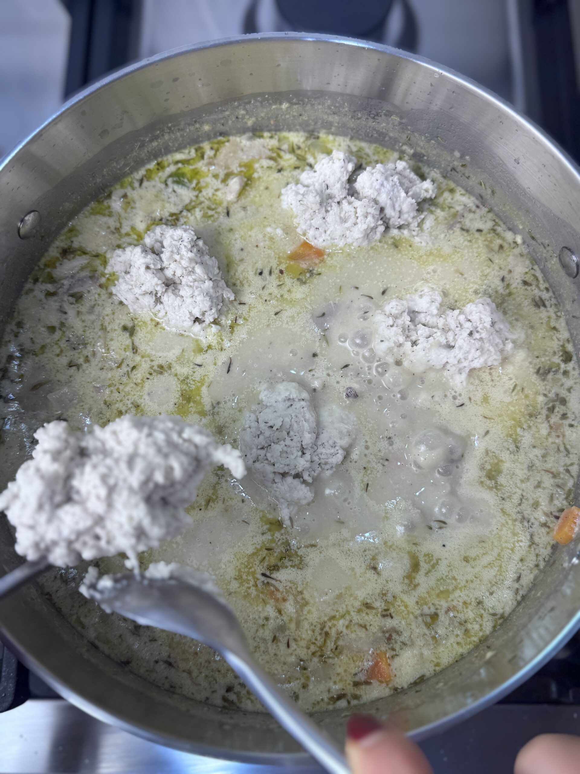 Using a cookie scoop or two spoons, drop small balls of dough directly into the soup. Space them out evenly and gently press down so soup covers them slightly.