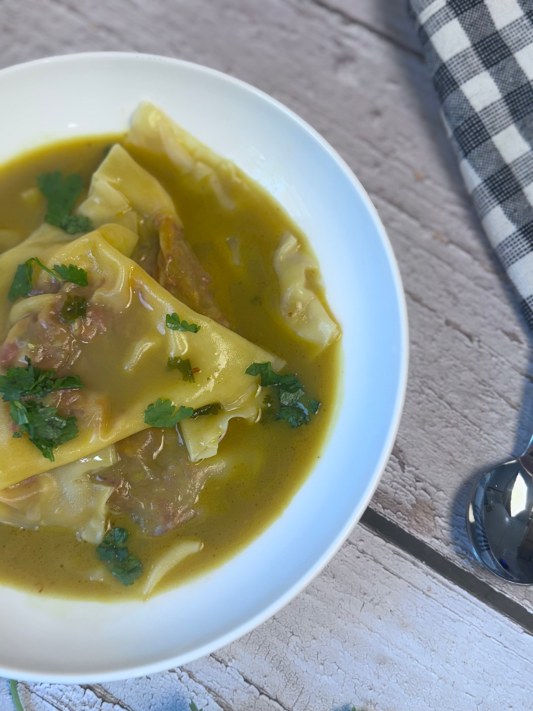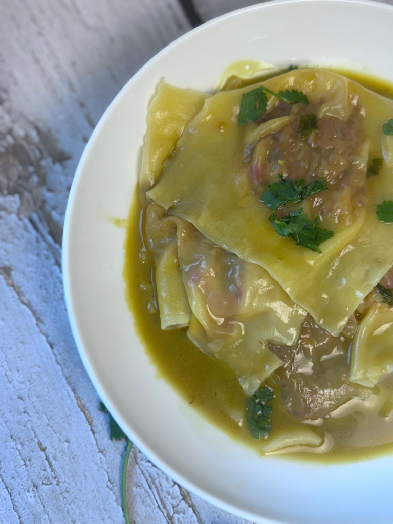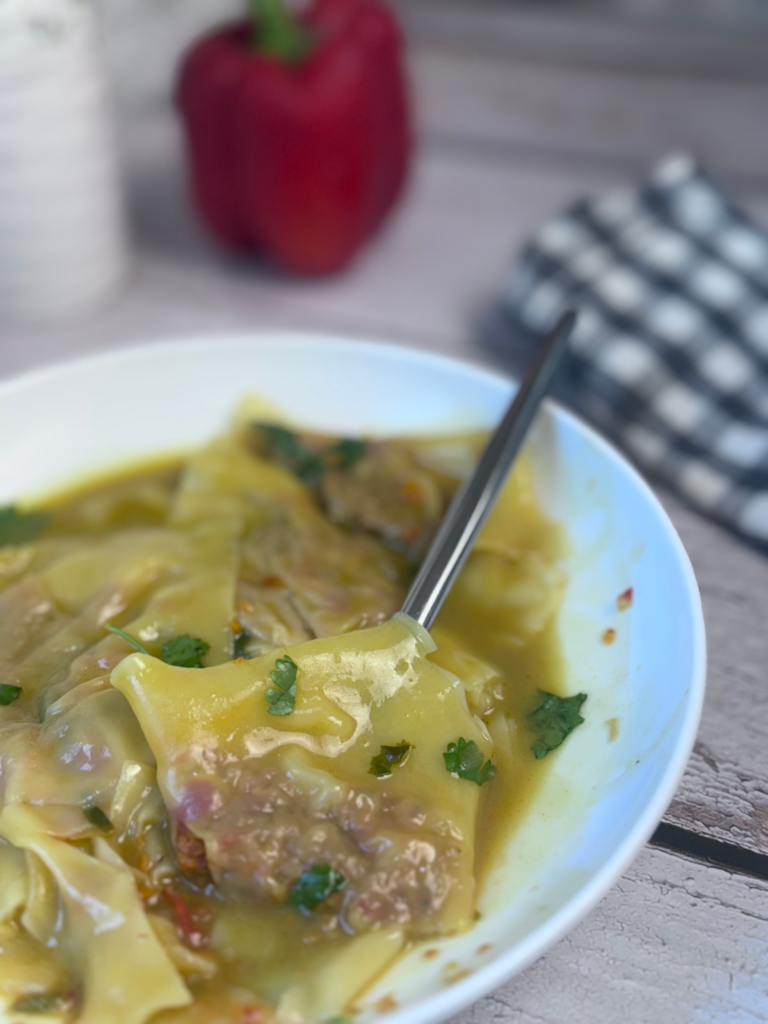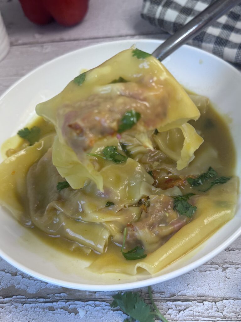Silky wonton “ravioli” filled with sautéed veggies swim in a creamy coconut curry broth for a warm, flavor-packed twist on soup season.