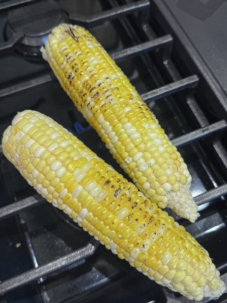 • Remove husks from the corn. Working 1-2 ears at a time, roast over an open flame on a gas burner until a nice char forms on all sides.