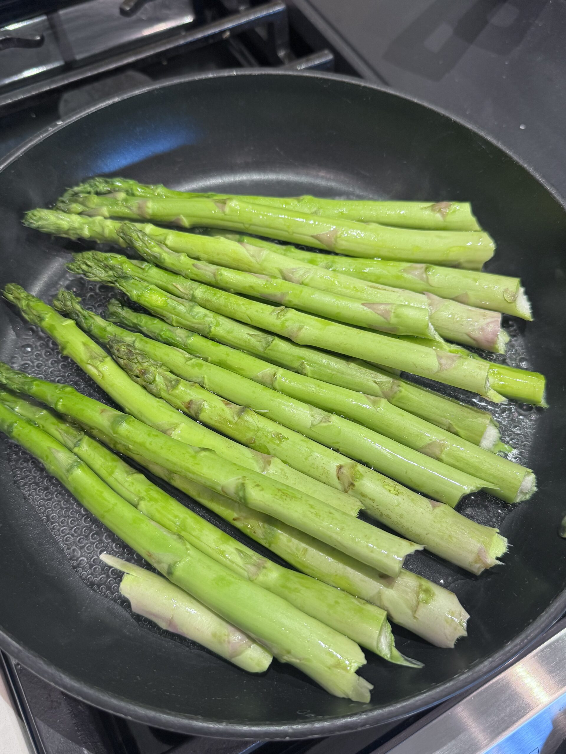 • In a large frying pan, add 3-4 tablespoons of water over high heat. Add asparagus spears and blanch for 3 minutes until bright green and firm.