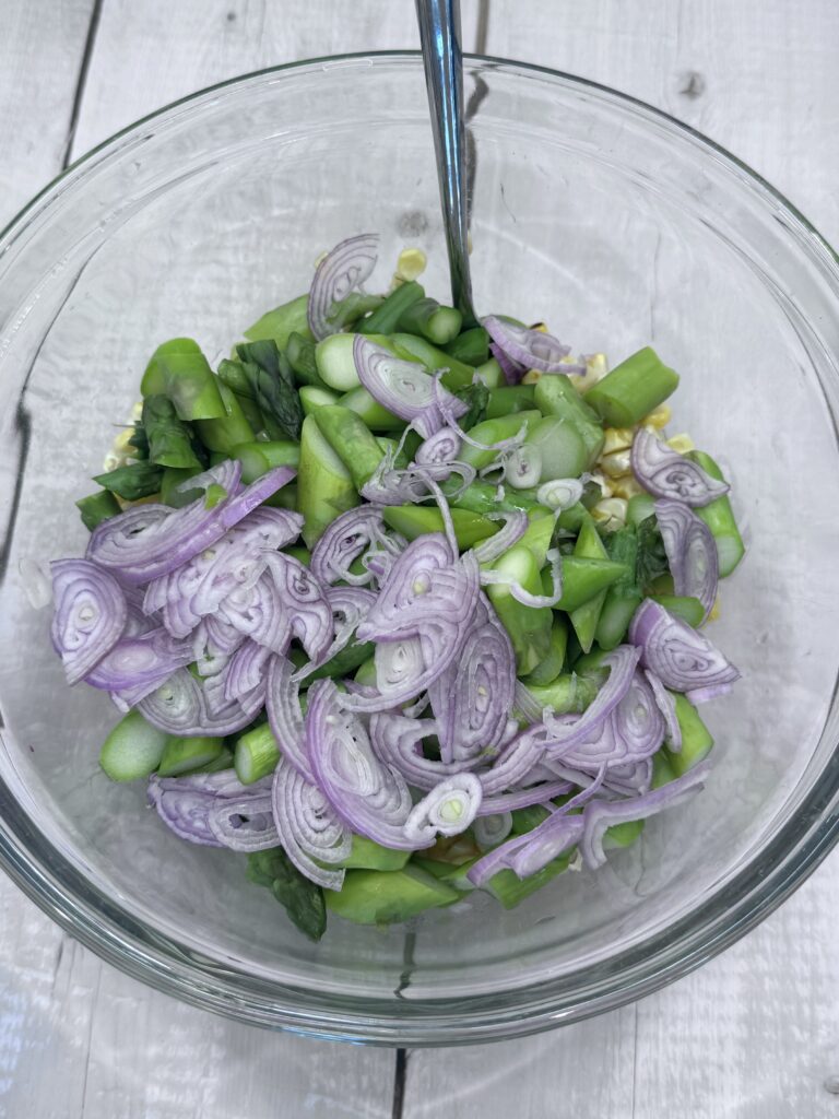 - Place the corn in a large bowl. Add the asparagus and shallots. Add the green onions.