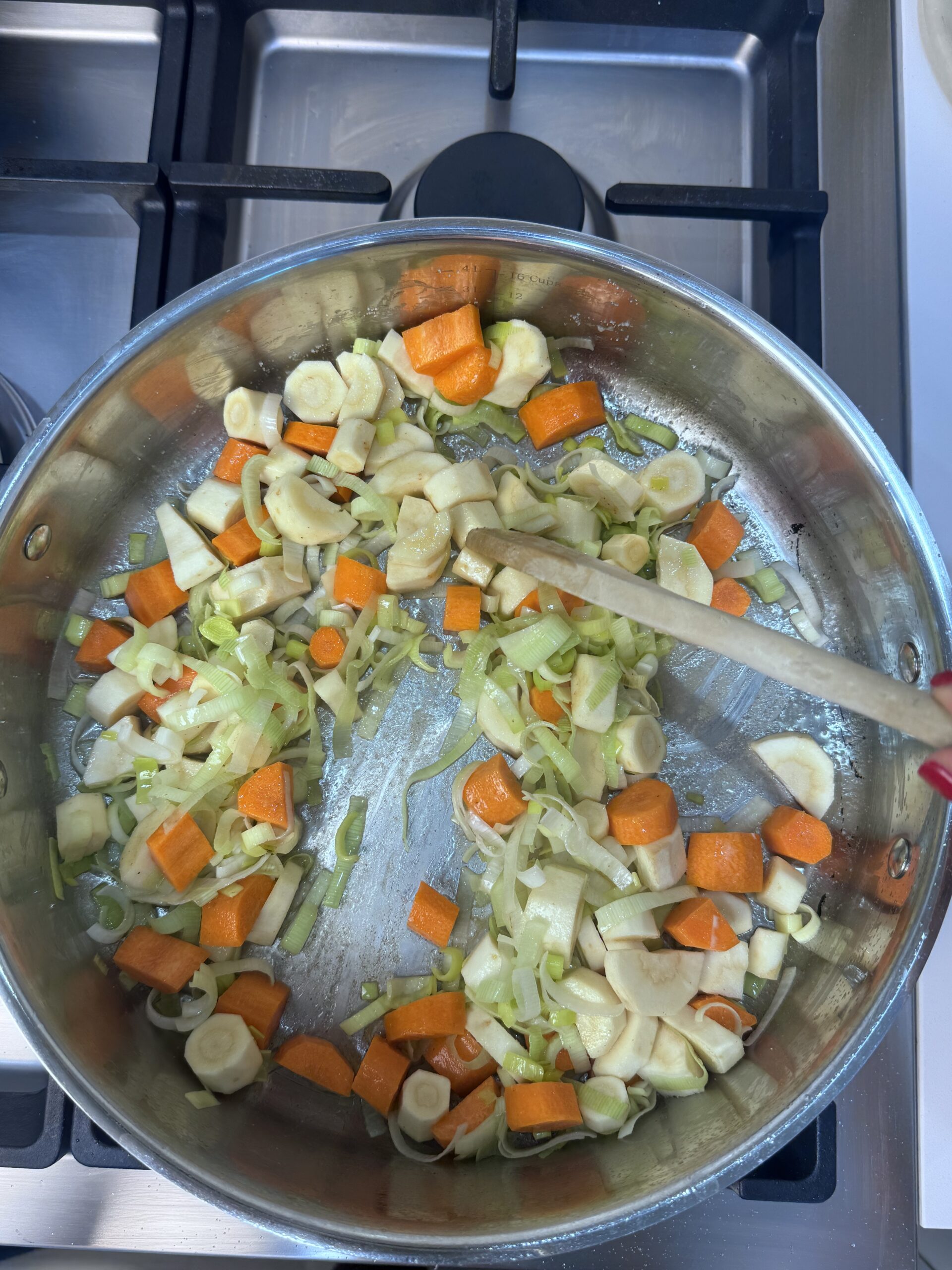 - In a large saute pan or skillet, melt butter over medium-high heat. Add leek, parsnips, carrots, and 1 teaspoon salt; cook, stirring frequently, until slightly soft, 3 to 5 minutes.Â