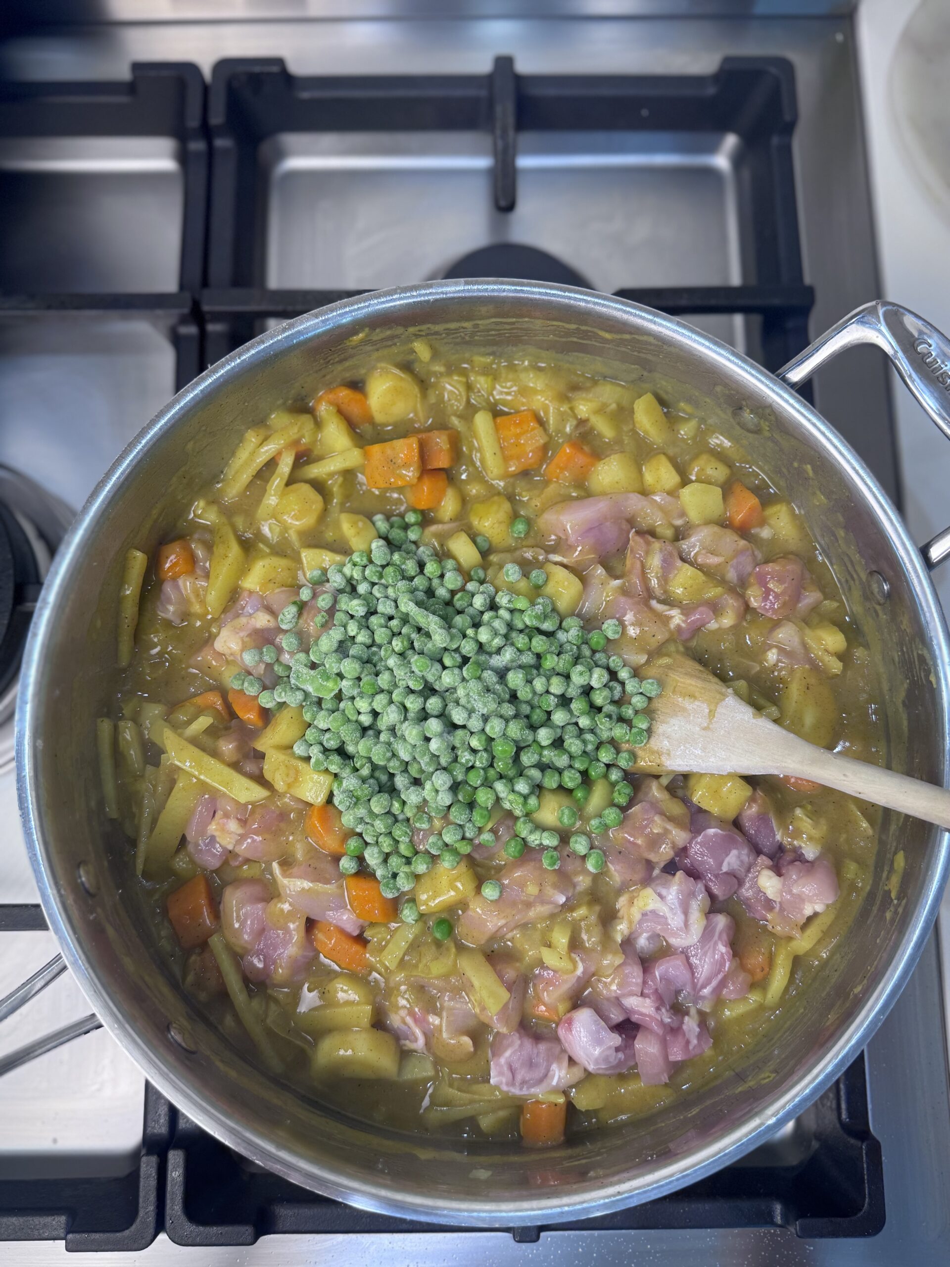 - Add flour; cook, stirring until golden, 1 to 2 minutes. Whisking constantly, stir in broth, potato, and curry powder. Bring to a boil; then reduce heat and simmer very gently until potato is tender, stirring occasionally, 8 to 10 minutes. Season with salt and pepper. Let cool completely. Stir in chicken and peas.