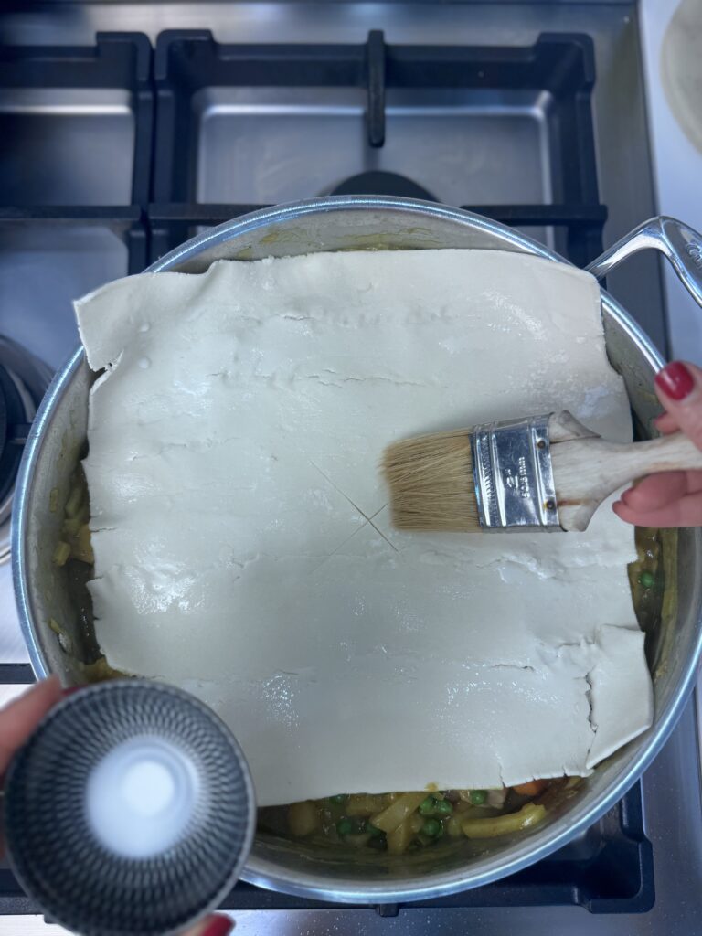 Top with puff pastry, trimming to fit. Cut an “X” in the center to vent. Brush with milk.