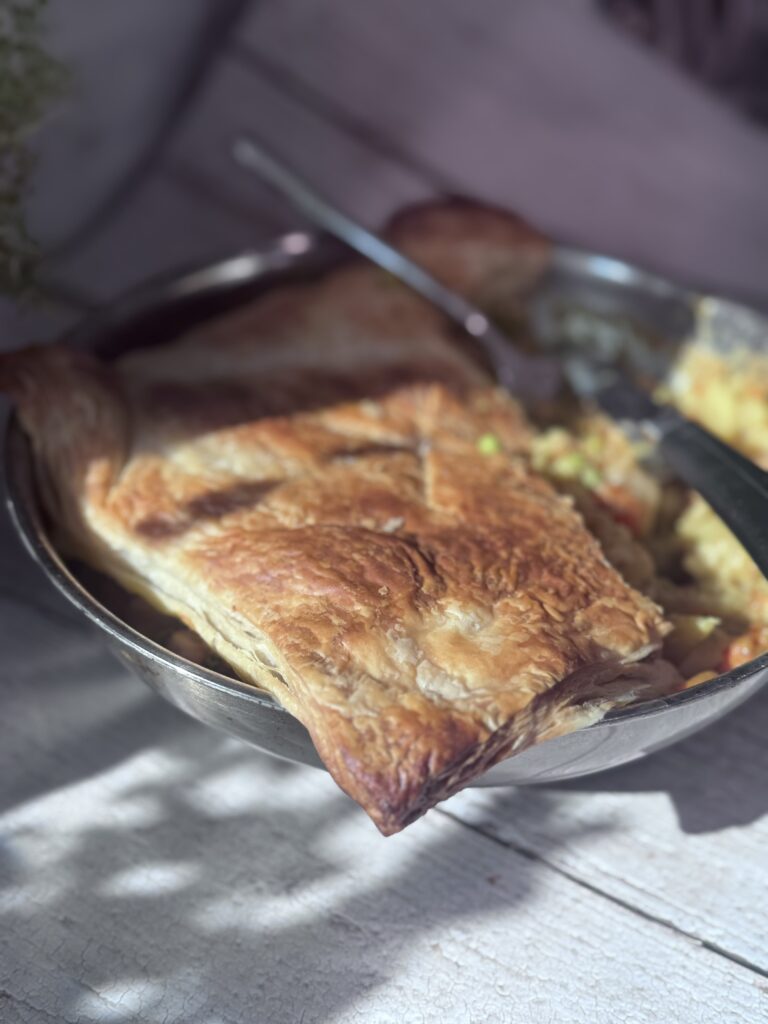 This pot pie uses seasonal root vegetables like carrots, parsnips, and leeks—perfect for fall and great for reducing reliance on imported produce. Using chicken thighs instead of breast meat also makes better use of the whole bird, reducing food waste and supporting a more sustainable food chain. And store-bought puff pastry? It cuts energy and time spent baking a crust from scratch, which saves electricity and effort (your AC bill will thank you).