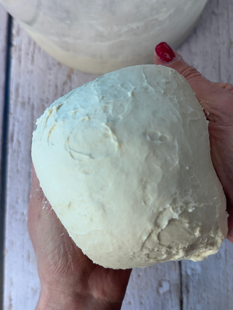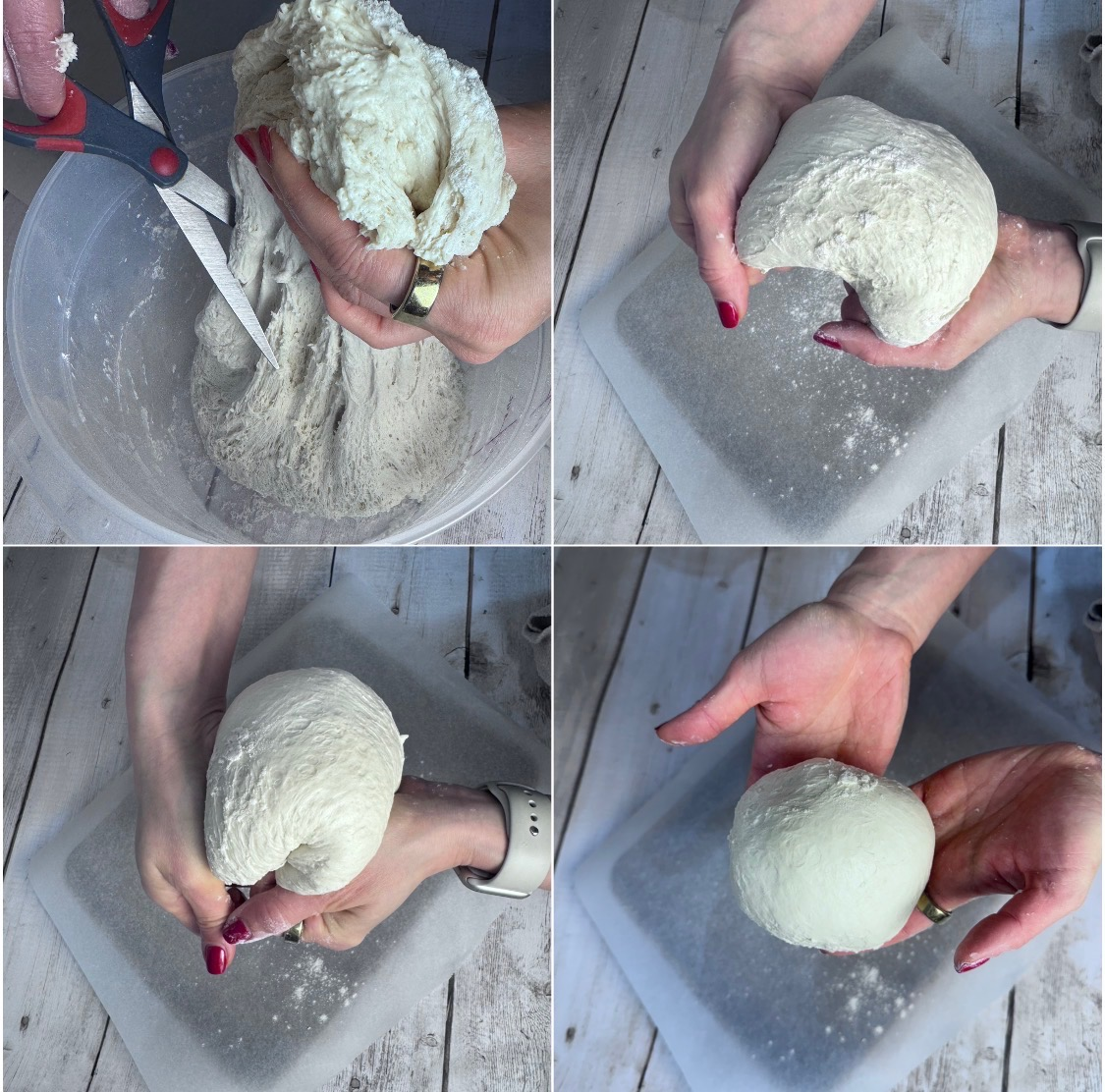 Dust the surface of the dough with flour. Using kitchen shears or a serrated knife, cut a grapefruit-sized piece (about 1 lb). Gently stretch the dough edges toward the bottom, rotating and forming a round boule. This should take less than a minute.
