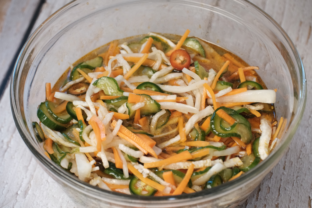 1/2 cup carrots, 1/2 cup cucumbers, 1/2 cup daikon1/4 cup rice vinegar, 1/4 cup water, 1 1/2 tbs sugar, 1/2 tsp salt, 1 tsp sesame oil -