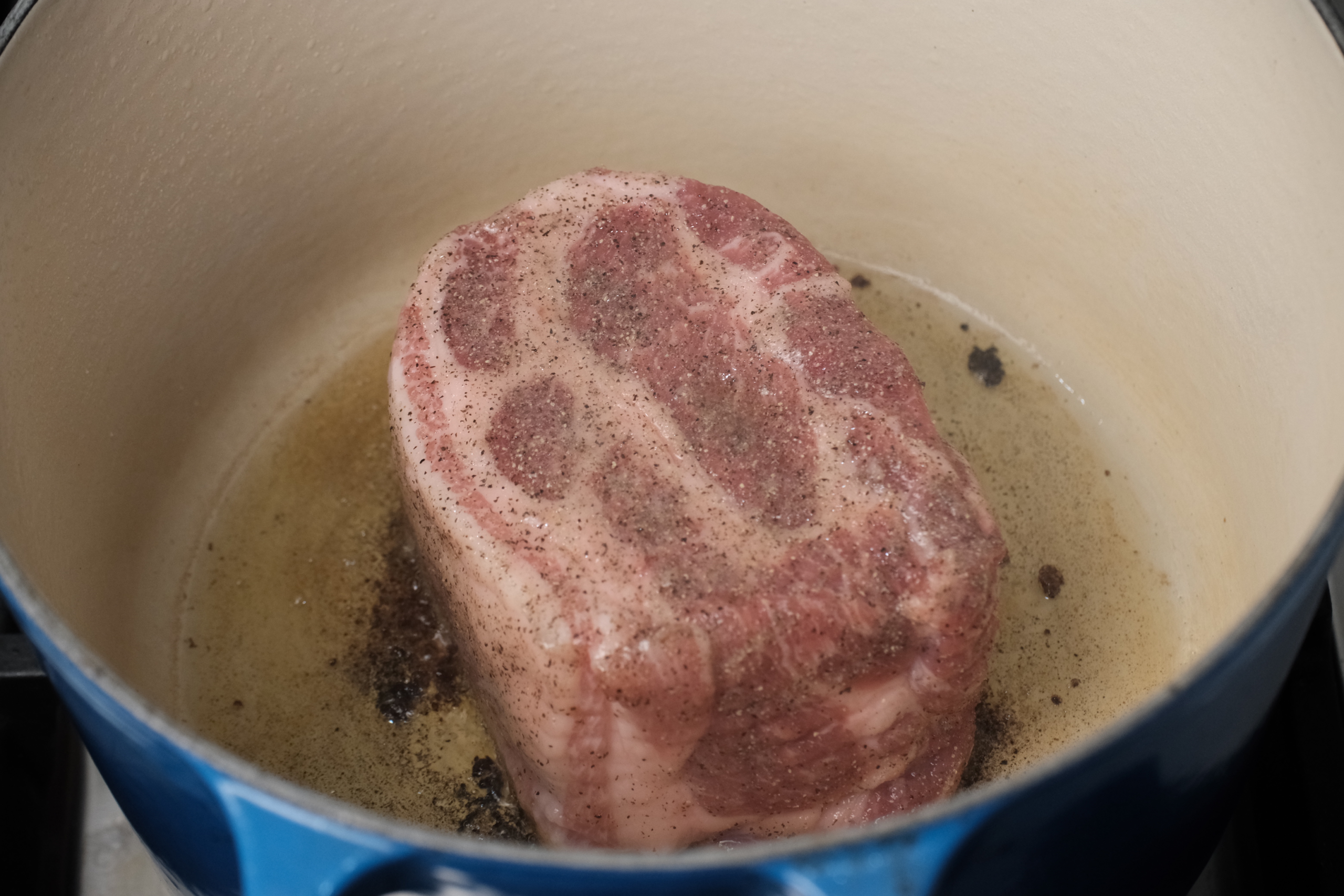 Season the pork with salt, black pepper, and sugar. Heat a large dutch oven over medium-high heat and add cooking oil. Sear the pork on all sides, 2-3 minutes until a crust forms. Remove the pork to a plate and set aside.2 1/2 lbs pork shoulder or butt, 2 tsp alt, 1 tsp black pepper, 2 tbs sugar, 2 tbs cooking oil -