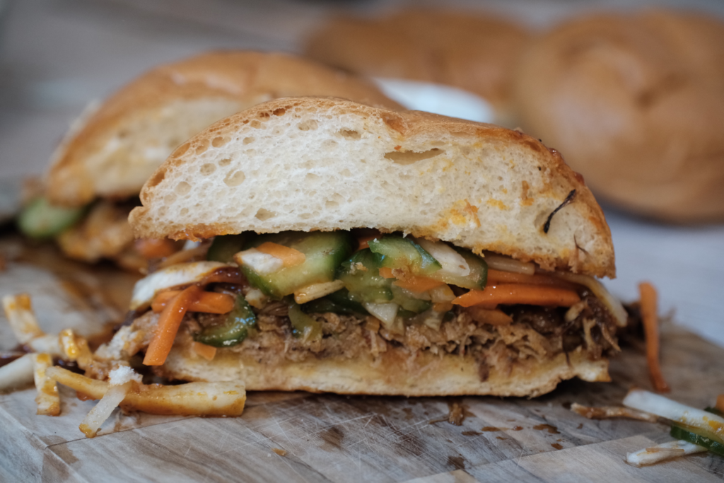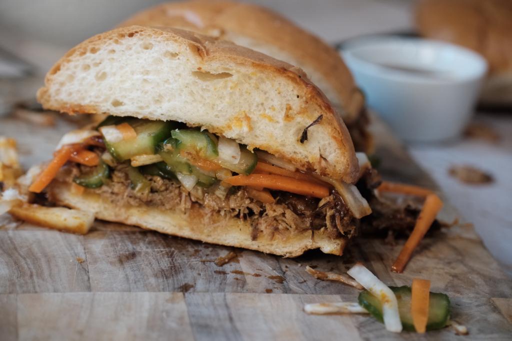 Then came the balance. Rich pork needs contrast, so I added quick pickled vegetables, similar to what you’d find in a bánh mì. Bright, crisp, slightly sweet—exactly what this sandwich needed. And because I wasn’t about to stop there, I blended up a kimchi mayo to add another layer of flavor.