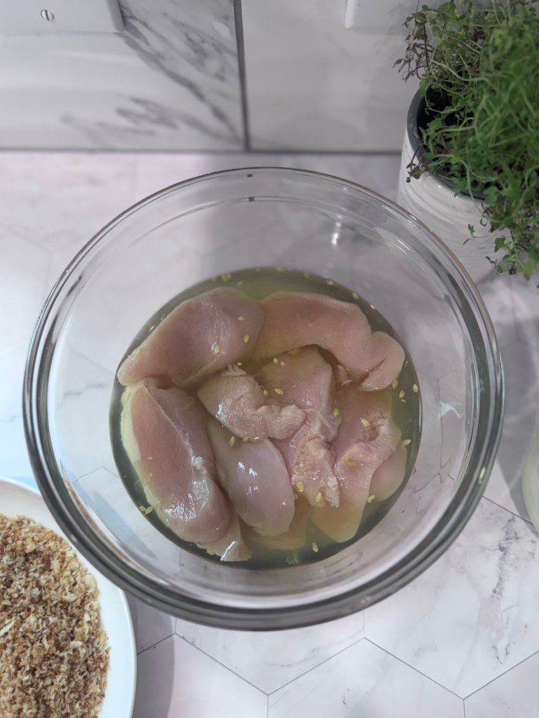 Add chicken tenders and pickle juice to bowl. Marinate for 20-30 minutes. Drain and pat chicken dry with paper towels.