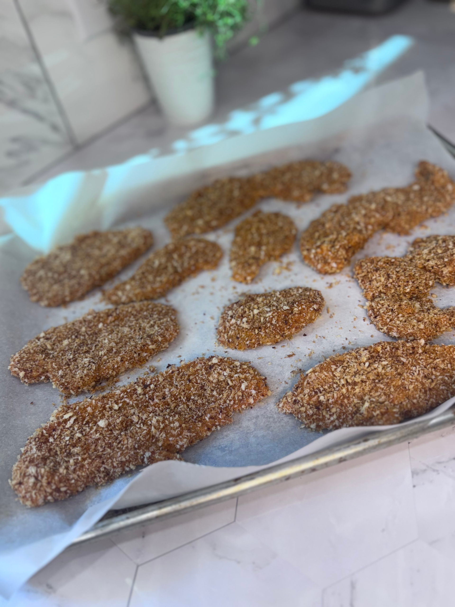 Remove chicken from marinade. Dredge each tender in the toasted panko mixture, pressing to adhere fully. Place on the prepared baking sheet, spaced out evenly.