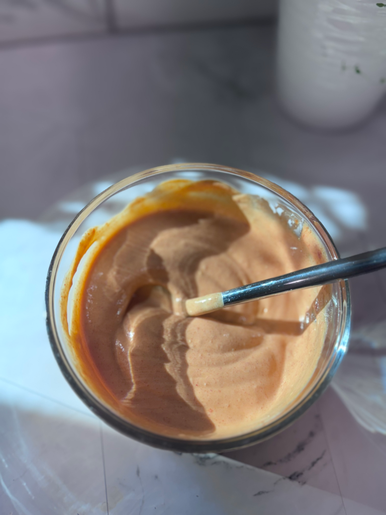 1/3 cup mayonnaise, 1 tbs gochujang, 1/2 tsp garlic powder, 1/4 tsp onion powder, 1/4 tsp salt