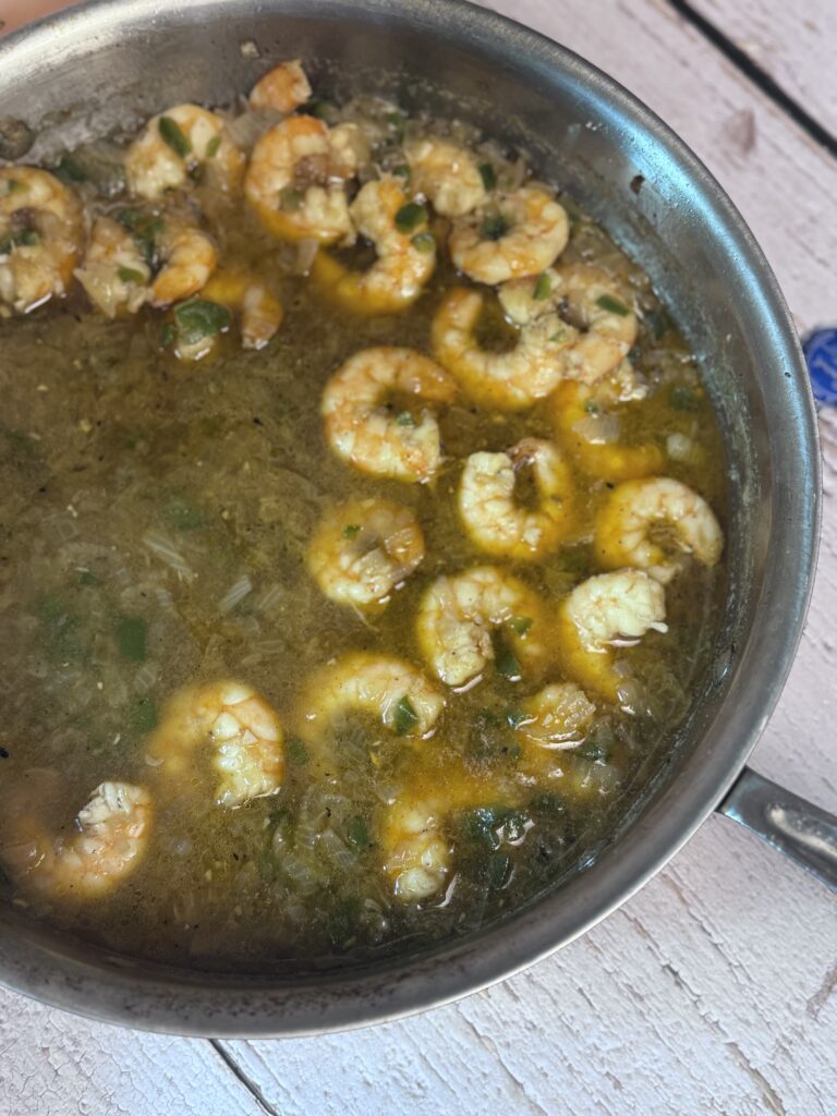 • Add 2 tablespoons butter to the skillet. Add onions, garlic and jalapeno peppers. Saute for 1 medium heat. Add the shrimp, salt, and pepper. Saute for 2 to 3 minutes, or until shrimp is just cooked.