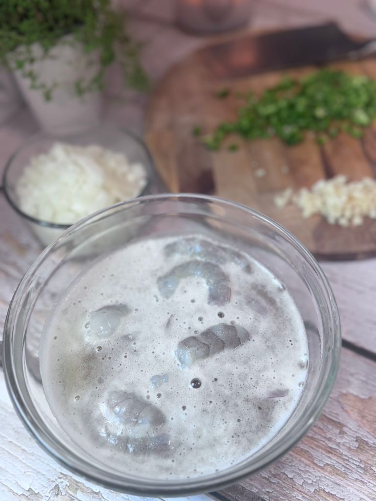 In a bowl, combine 2 lbs medium shrimp (peeled & deveined) with 12 oz Mexican beer. Let soak for 30 minutes. Drain.