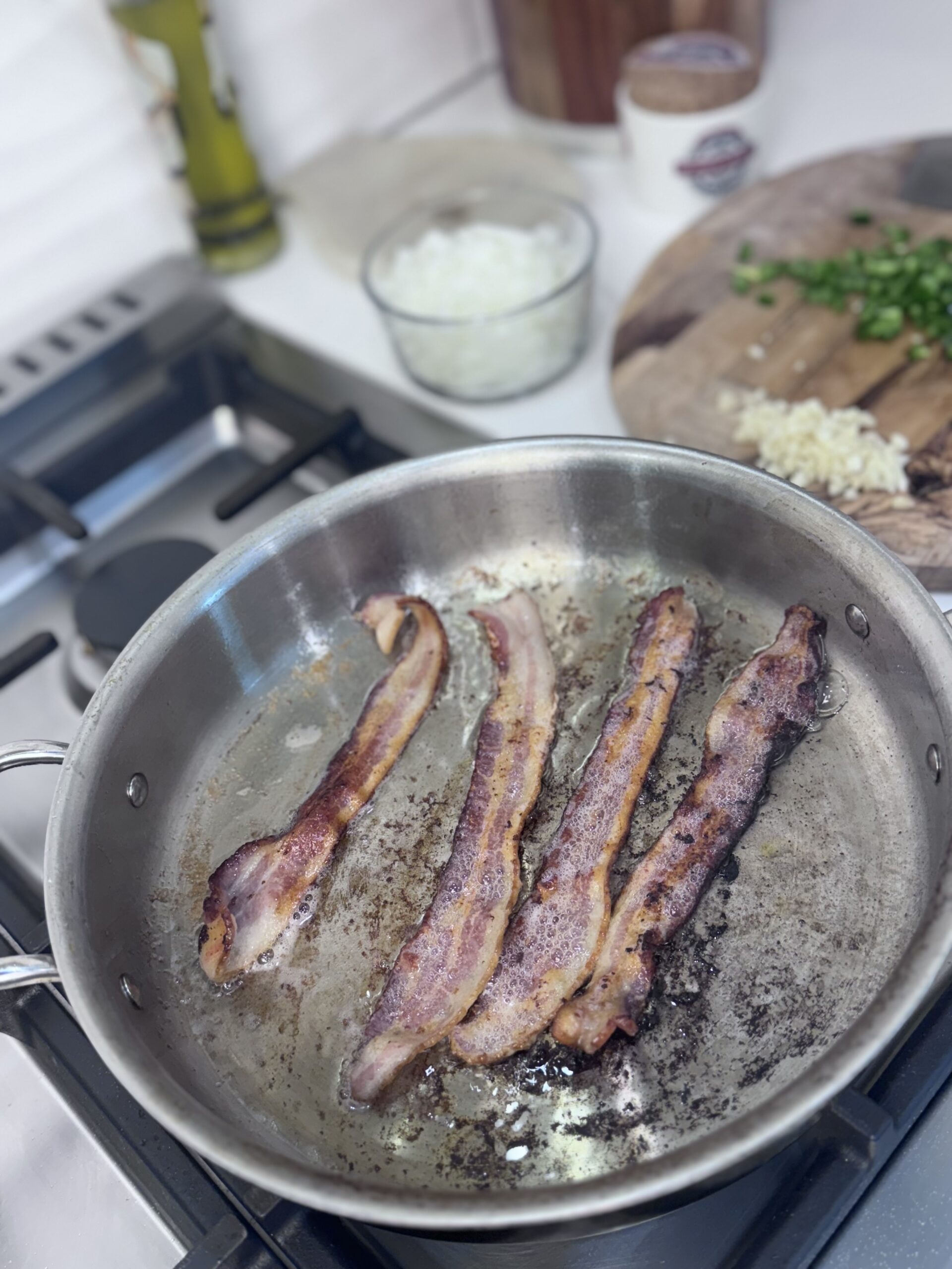 3. In a large skillet, cook the bacon until crispy. Drain on paper towels. Let the bacon cool, then crumble. Save one tablespoons of bacon grease.