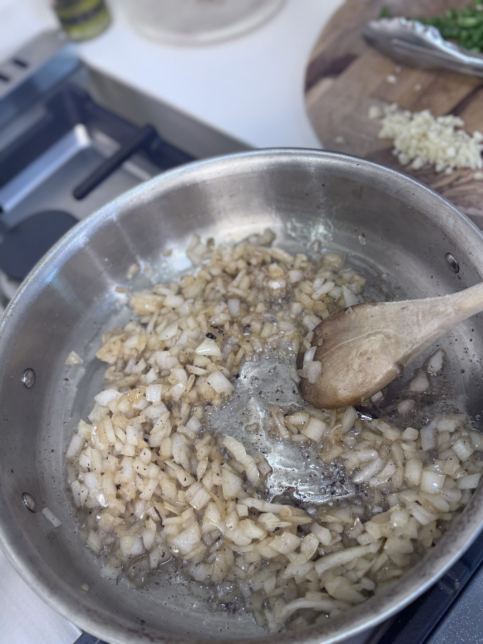 Heat bacon grease over medium heat. Add 1 large chopped onion and sauté 2 minutes until translucent. Remove to a plate and discard extra fat.