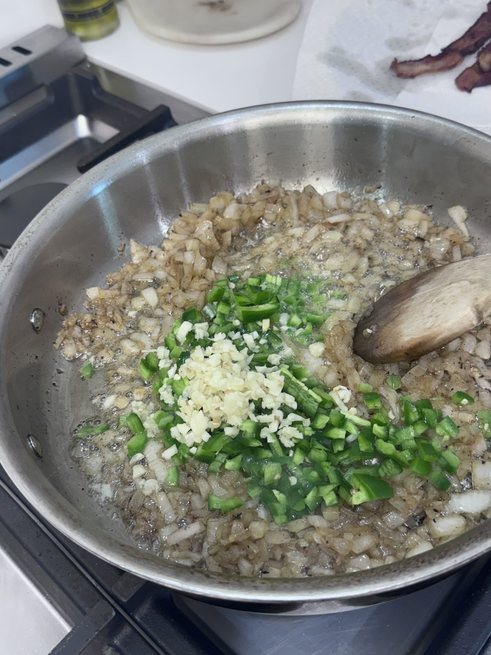 In the same pan, melt 2 tablespoons butter. Add back the onions, 2 minced garlic cloves, and 2 minced jalapeños. Sauté 1 minute.