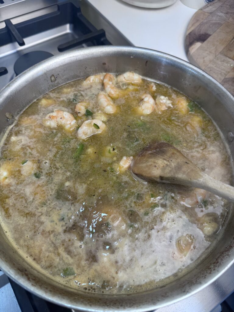 Pour in 2 cups of shrimp fumet and cook for 2 minutes to bring it all together.