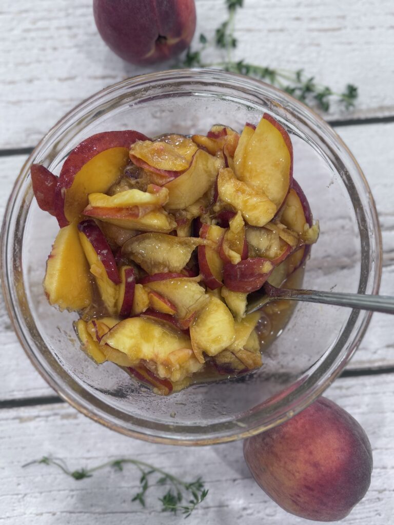 - In a bowl, mix sliced peaches with maple syrup, vanilla, lemon juice, and brown sugar. Let sit for 15-30 minutes.