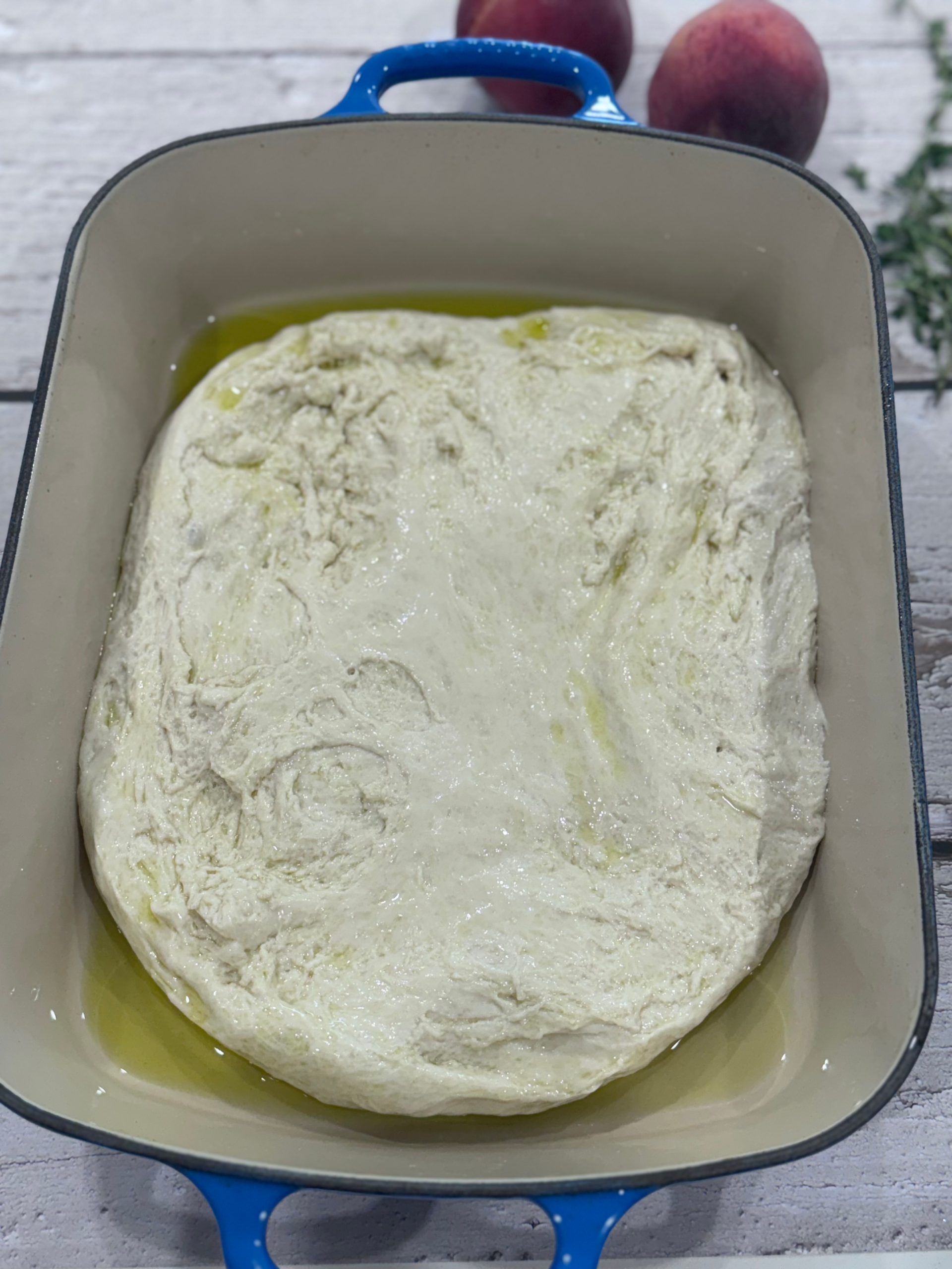 Grease your baking pan generously with olive oil (this is where crispy edges are born). Gently turn out the dough and fold edges toward center like you’re tucking in a baby focaccia. Flip seam-side down and proof uncovered for 45–60 minutes.