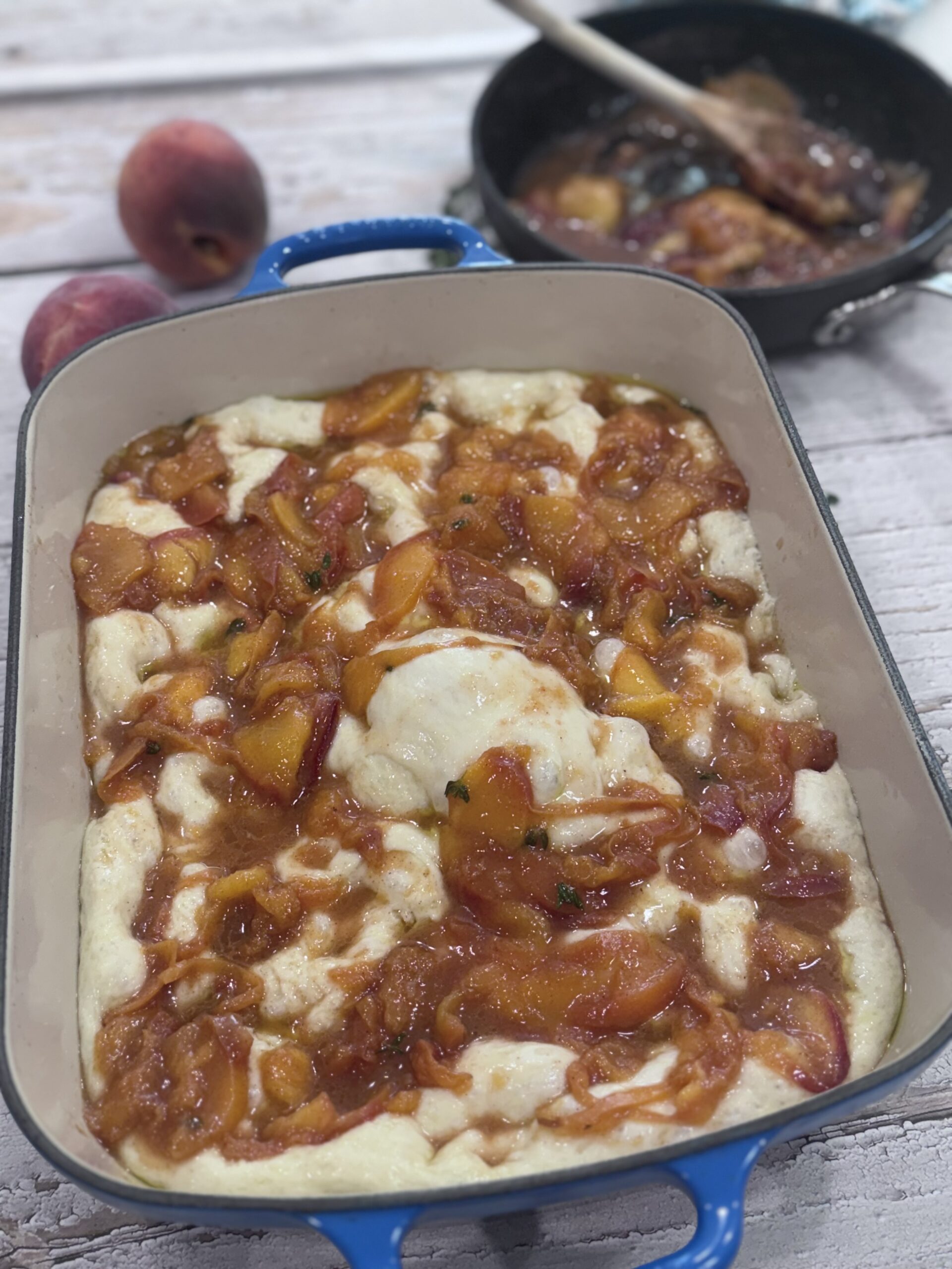 Dimple the dough like you’re pressing elevator buttons. Scatter the caramelized peaches on top, pressing a few into the dough for embedded fruity surprises. Drizzle with reserved syrup.
