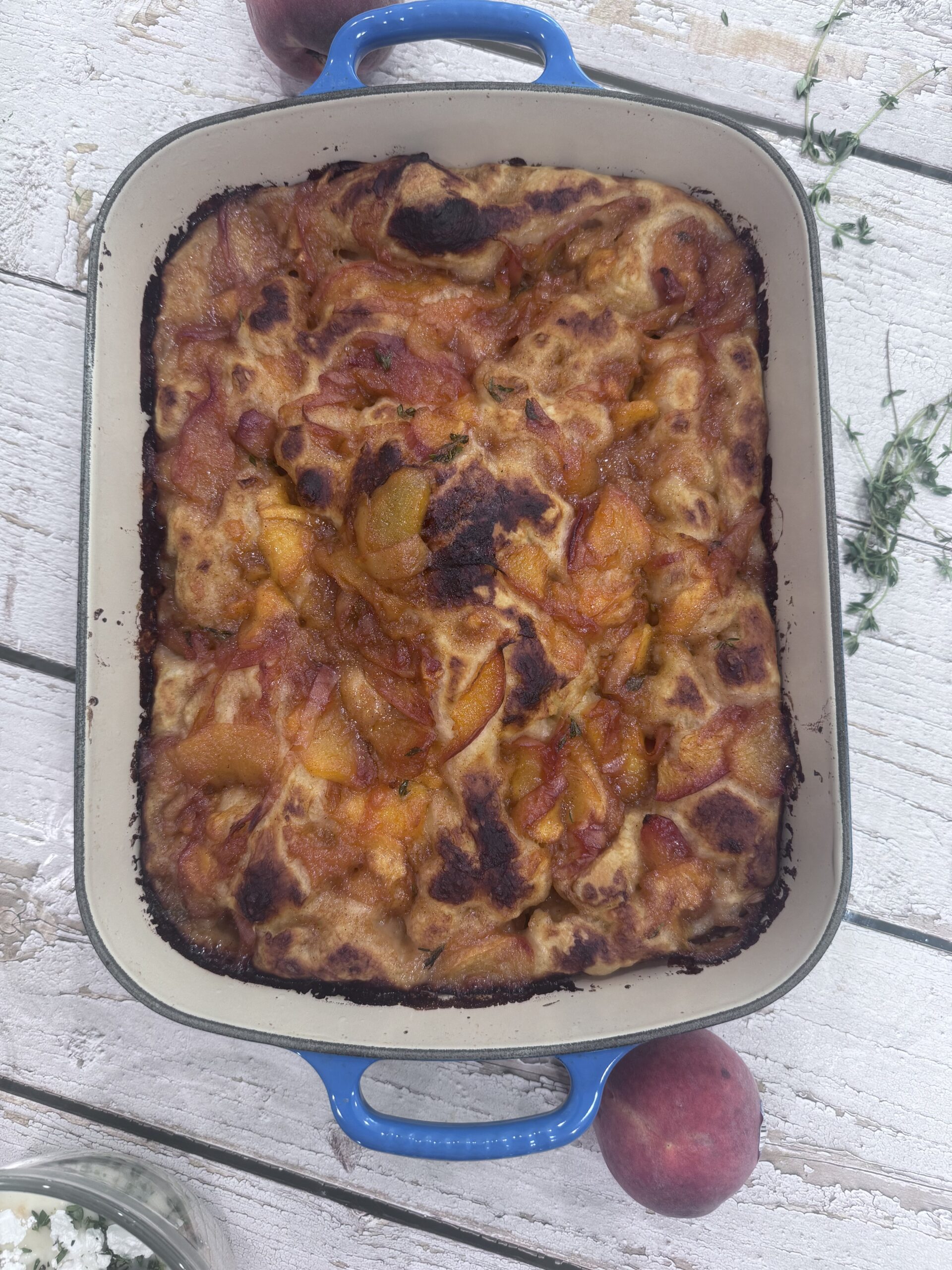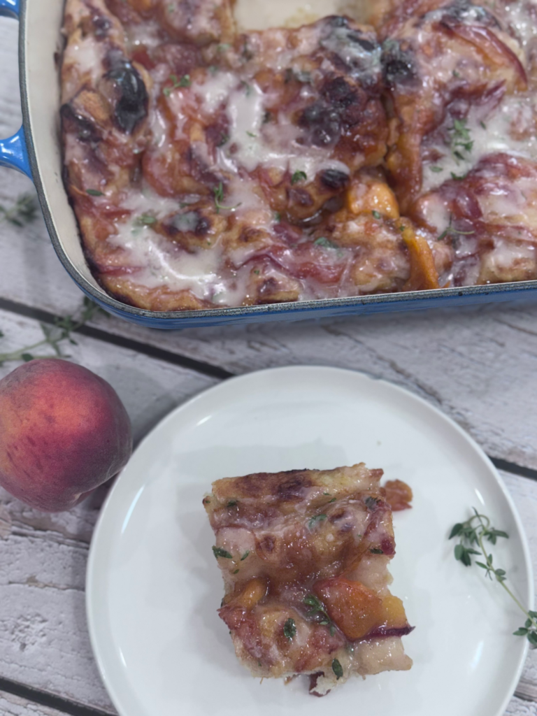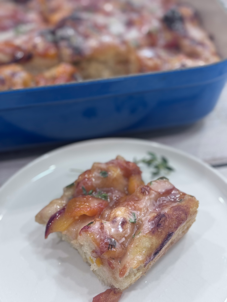 This summer stunner is what happens when a peach fritter and a slab of Italian focaccia fall in love, run off to brunch, and never come back.