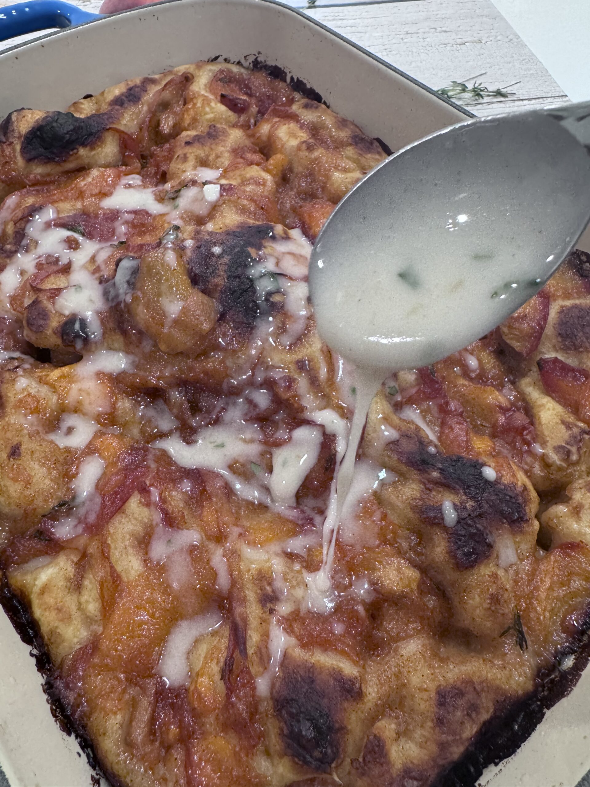 • Let the focaccia cool just a bit before glazing – Not piping hot. Warm. You want the glaze to melt in just enough to cling, not disappear.