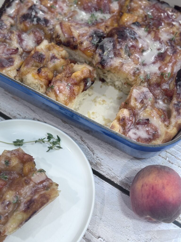 This Peach Fritter Focaccia blends pillowy bread, caramelized maple-vanilla peaches, and a drizzle of thyme glaze. A perfect summer brunch mashup!