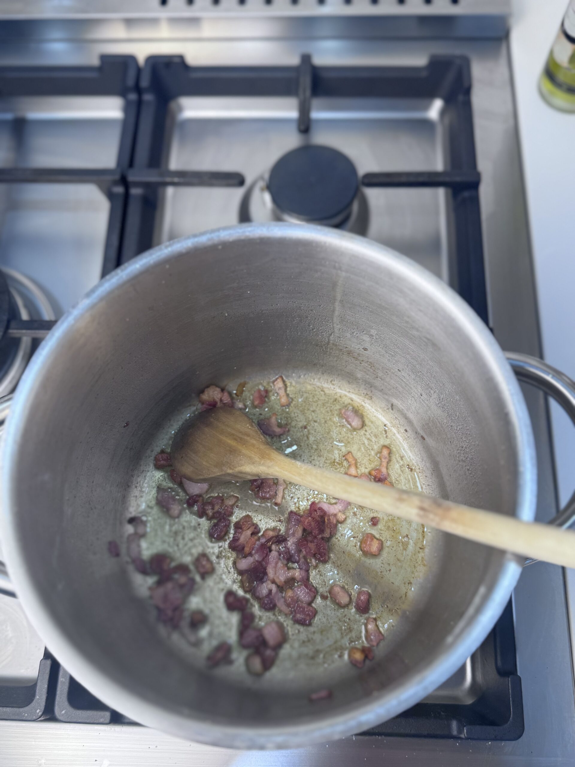 In the same pot you cooked the pasta in, heat olive oil over medium heat. Add diced bacon and cook 5–7 minutes, until rendered but not overly crisp.