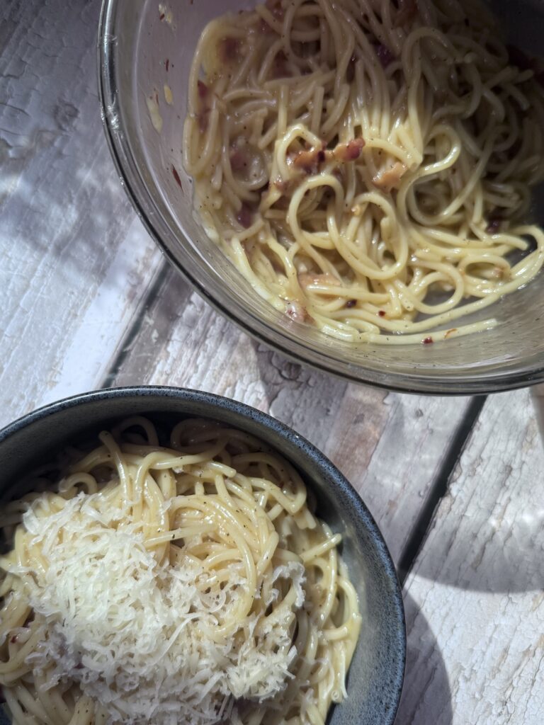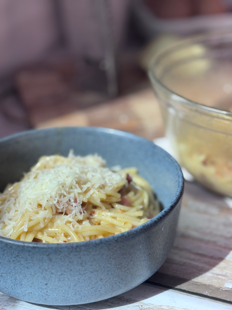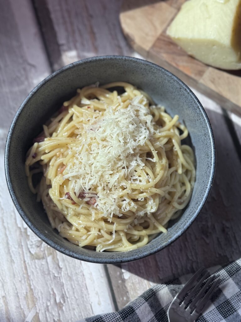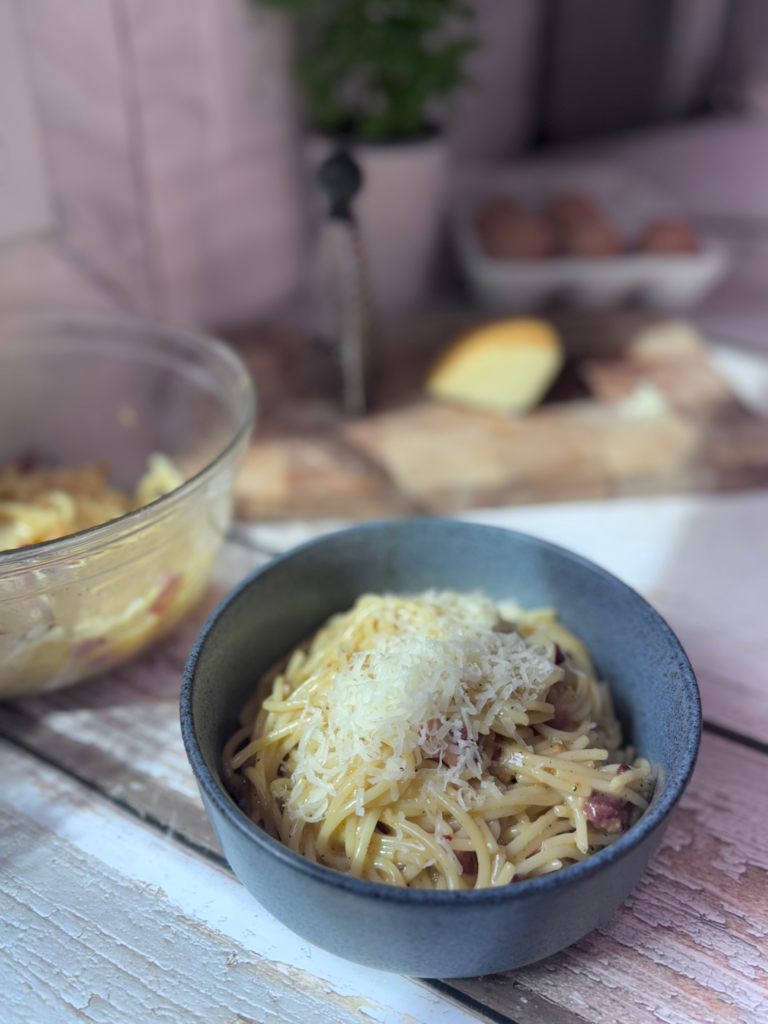Traditionalists will tell you carbonara is sacred: eggs, Pecorino or Parmesan, and maybe a little pancetta. But let’s be honest — smoked Gouda was sitting there in my fridge, giving me those “pick me” eyes, and the bacon needed rescuing before it crossed into “regret territory.” So here we are.