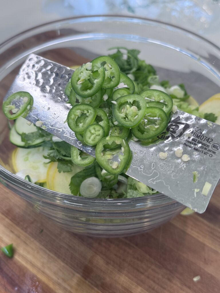 In a large bowl, toss the thinly sliced zucchini and yellow squash with the parsley, scallions, red wine vinegar, sliced serrano chili, and 1 1/2 teaspoons kosher salt until evenly mixed.