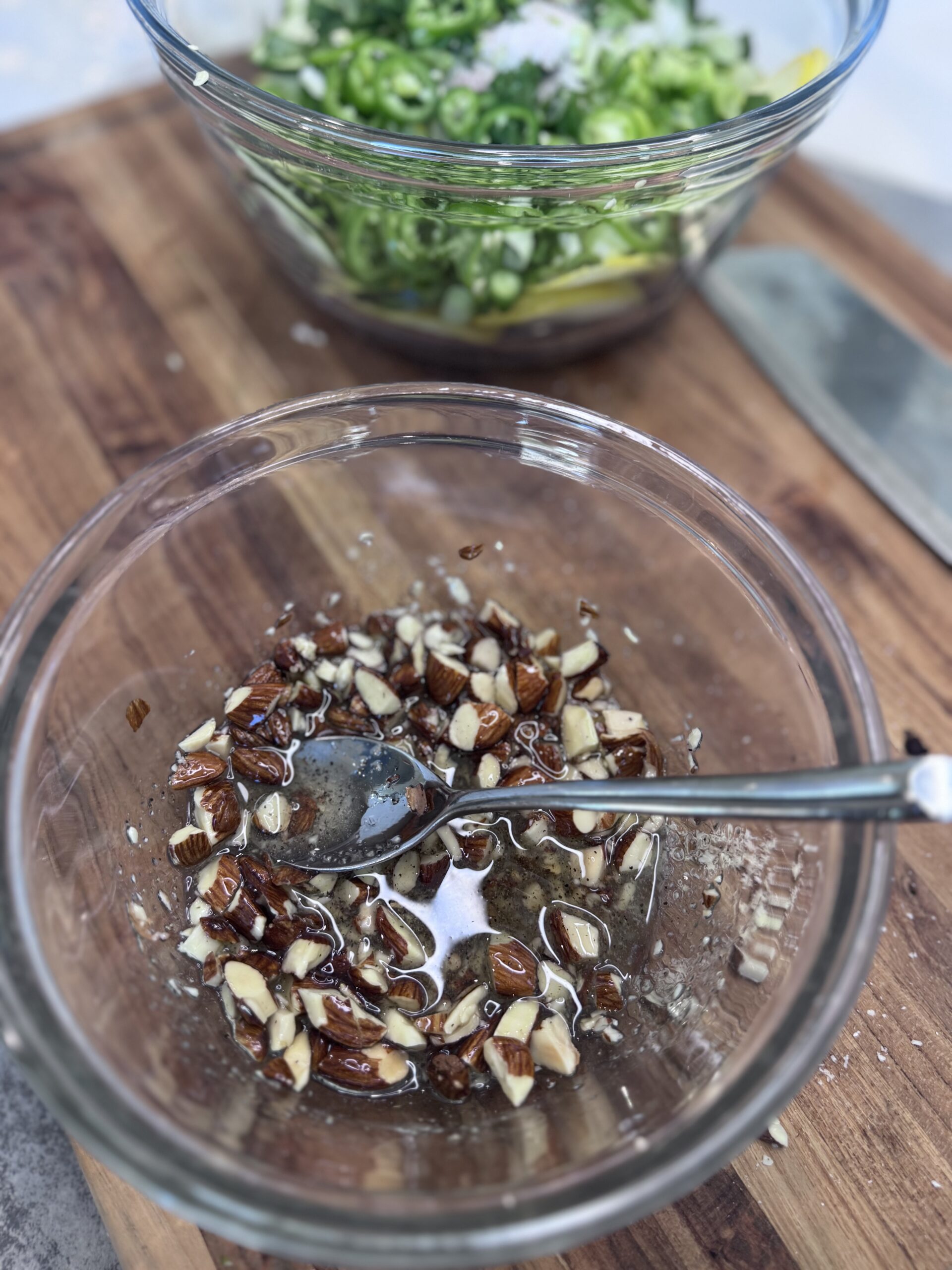 In a small bowl, mix together the chopped almonds, olive oil, black pepper, and remaining 1/2 teaspoon salt.
