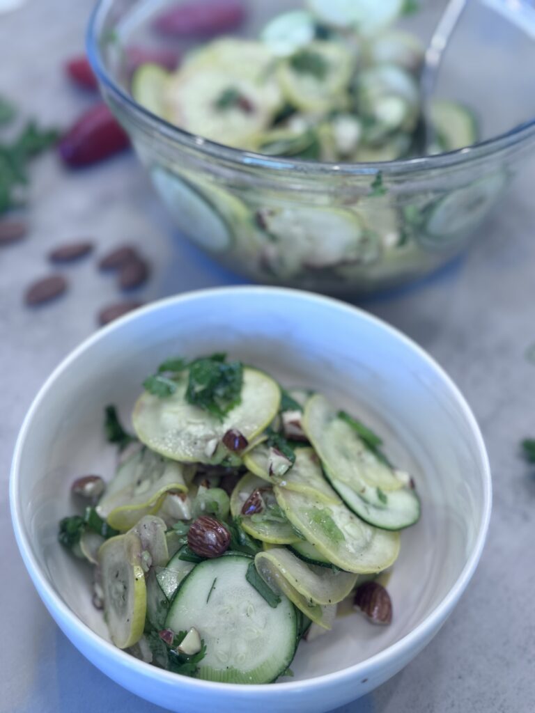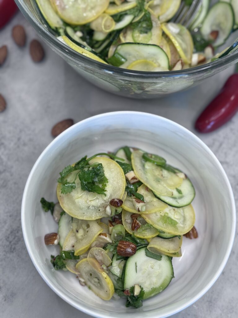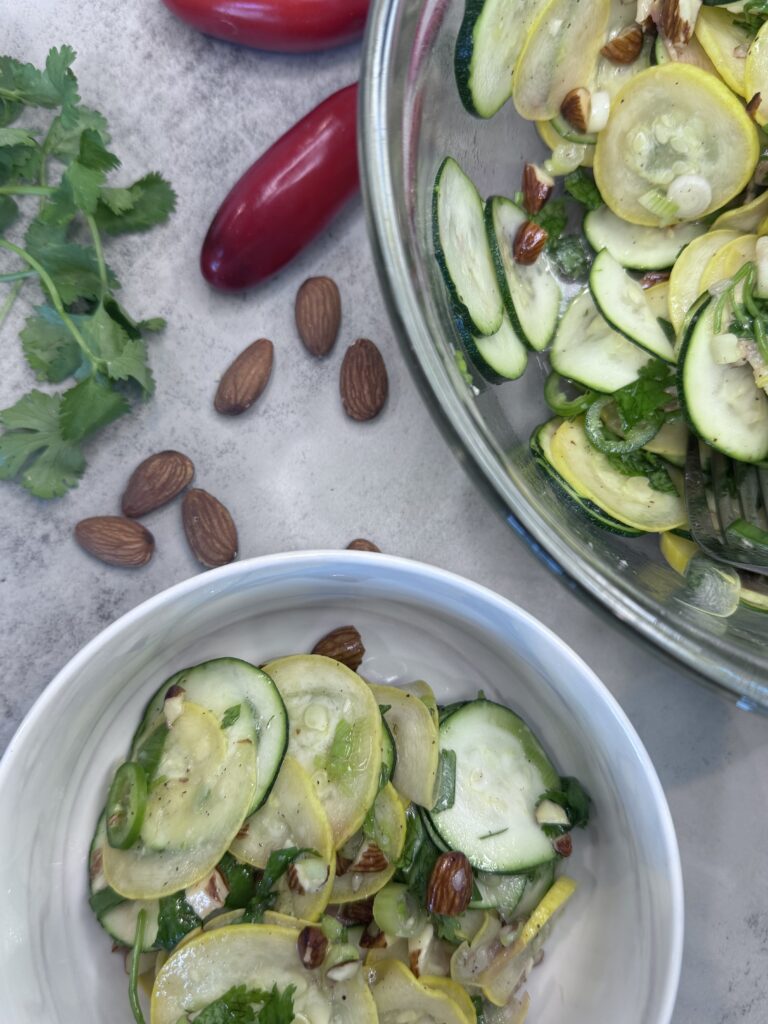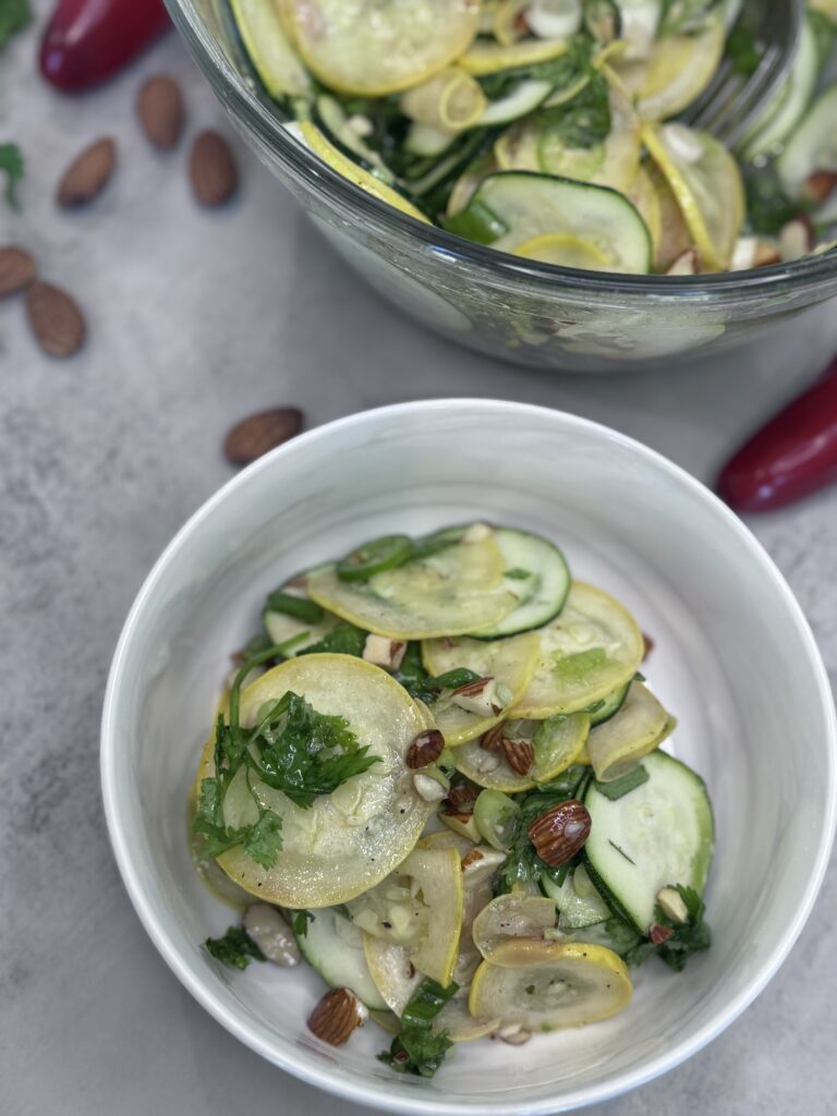 Light, no-cook Summer Squash Salad recipe with zucchini, herbs, almonds, and a zesty dressing—perfect for hot days or busy nights. Refreshing and easy!