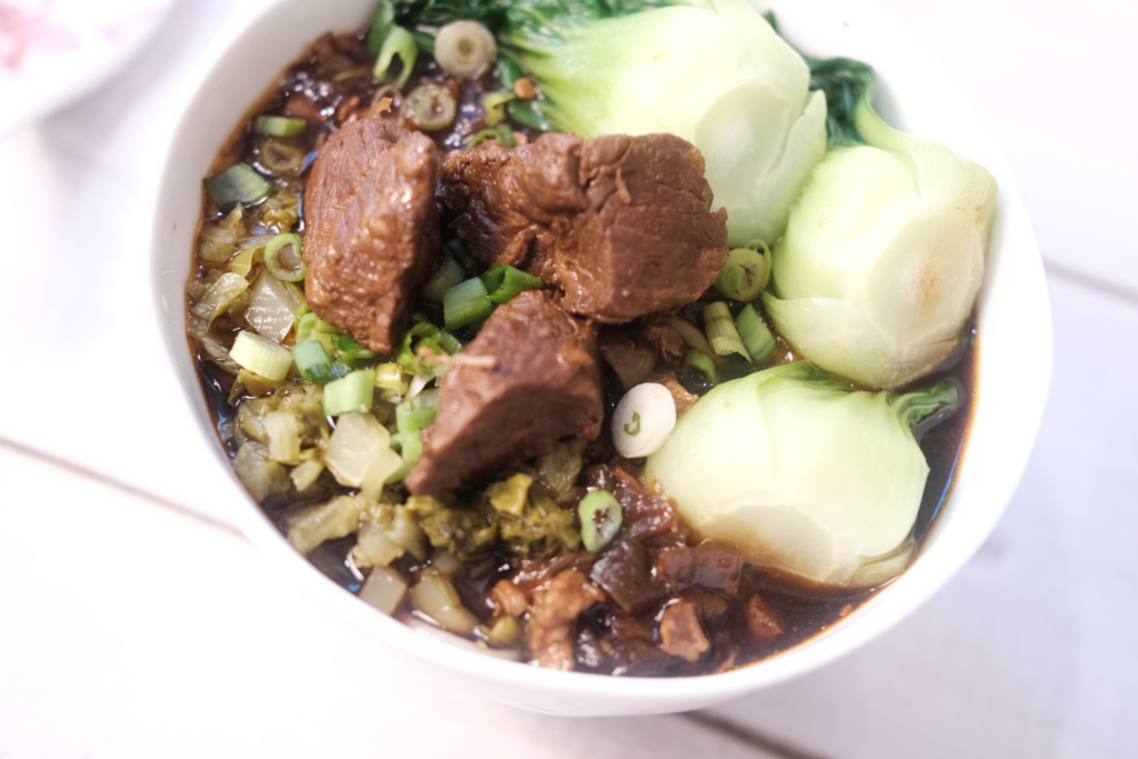 Layer noodles, beef, bok choy in a bowl. Pour hot broth over top. Garnish with scallions, cilantro, pickled mustard greens, and chili oil.