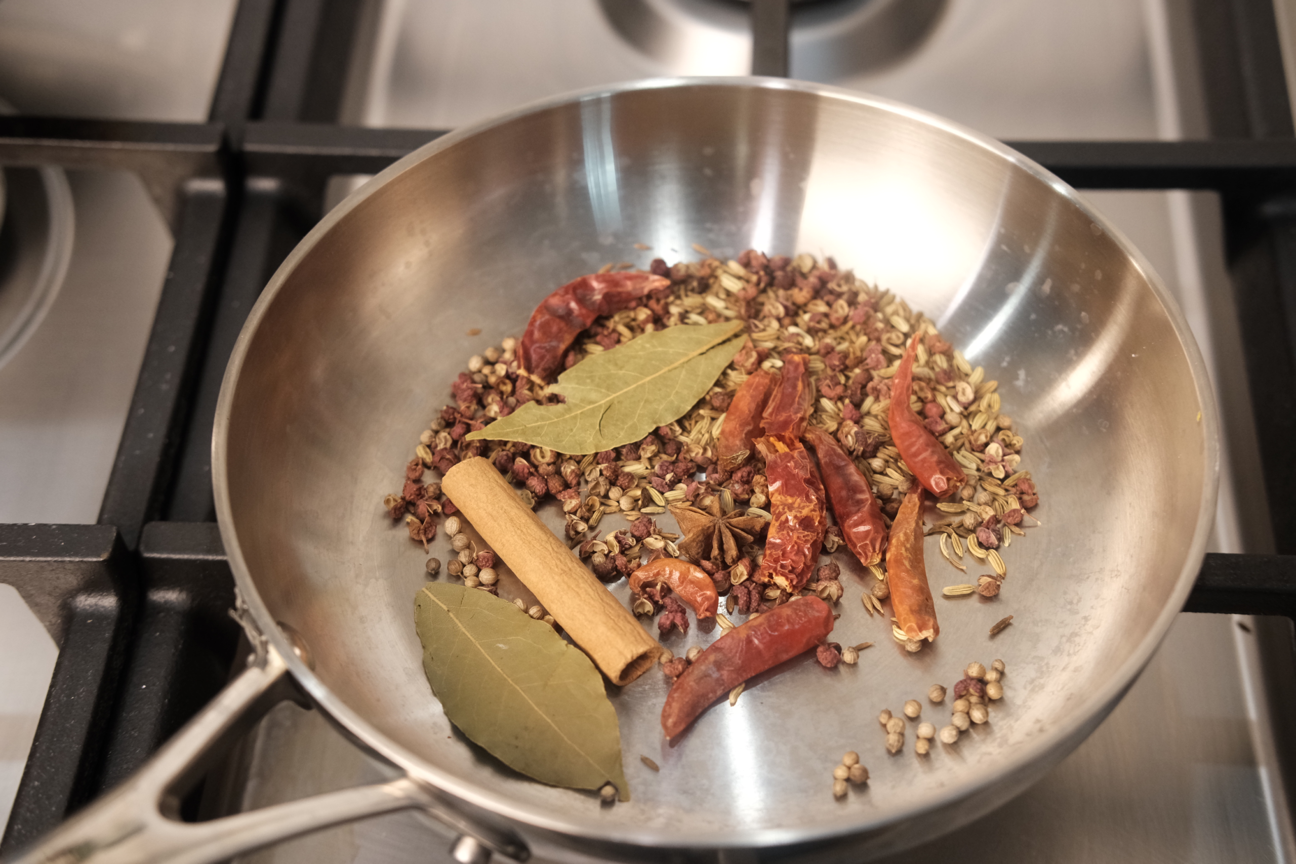 Create a spice sachet (lu bao) using cheesecloth and add: 1 star anise, 1 cinnamon stick, 3 bay leaves, 1 tbsp each: fennel, cumin, 1 tsp coriander seeds, 2 tbsp Sichuan peppercorns, ¼ tsp five-spice powder. Bring to boil, then reduce to low and simmer, uncovered, for 2.5 to 3 hours. Skim fat as needed.