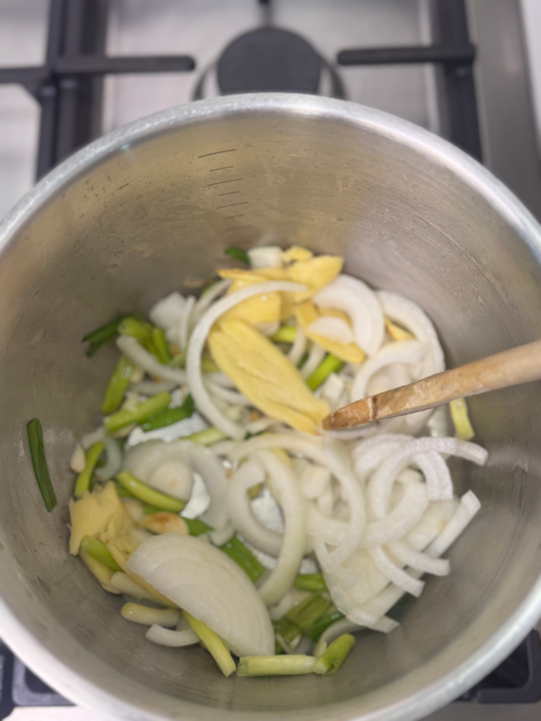 • Ginger, garlic, scallions, onion – Aromatic building blocks of the broth.