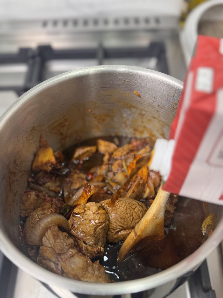 Return the beef to the pot. Add soy sauces, Shaoxing wine, sugar, and white pepper. Stir well. Add 8–10 cups beef stock.