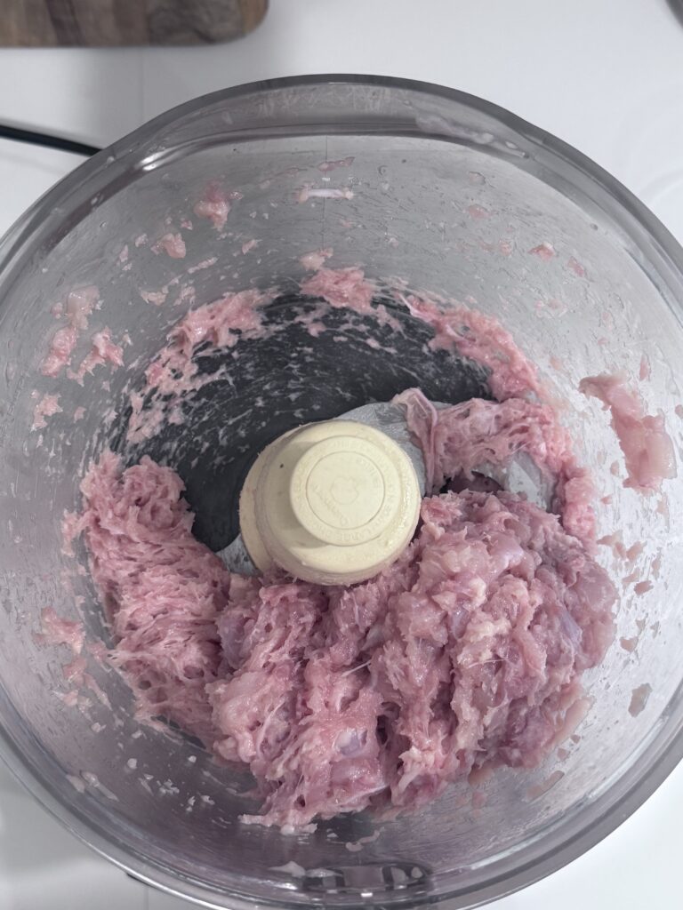 In a food processor, pulse chicken thighs until coarsely ground. Transfer to a bowl.