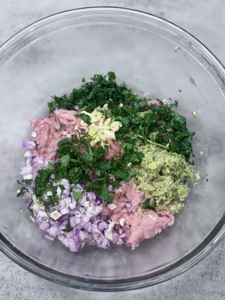Add fish sauce, shallots, garlic, lemongrass, chopped cilantro, cornstarch, salt, and pepper. Mix everything with your hands until well combined.