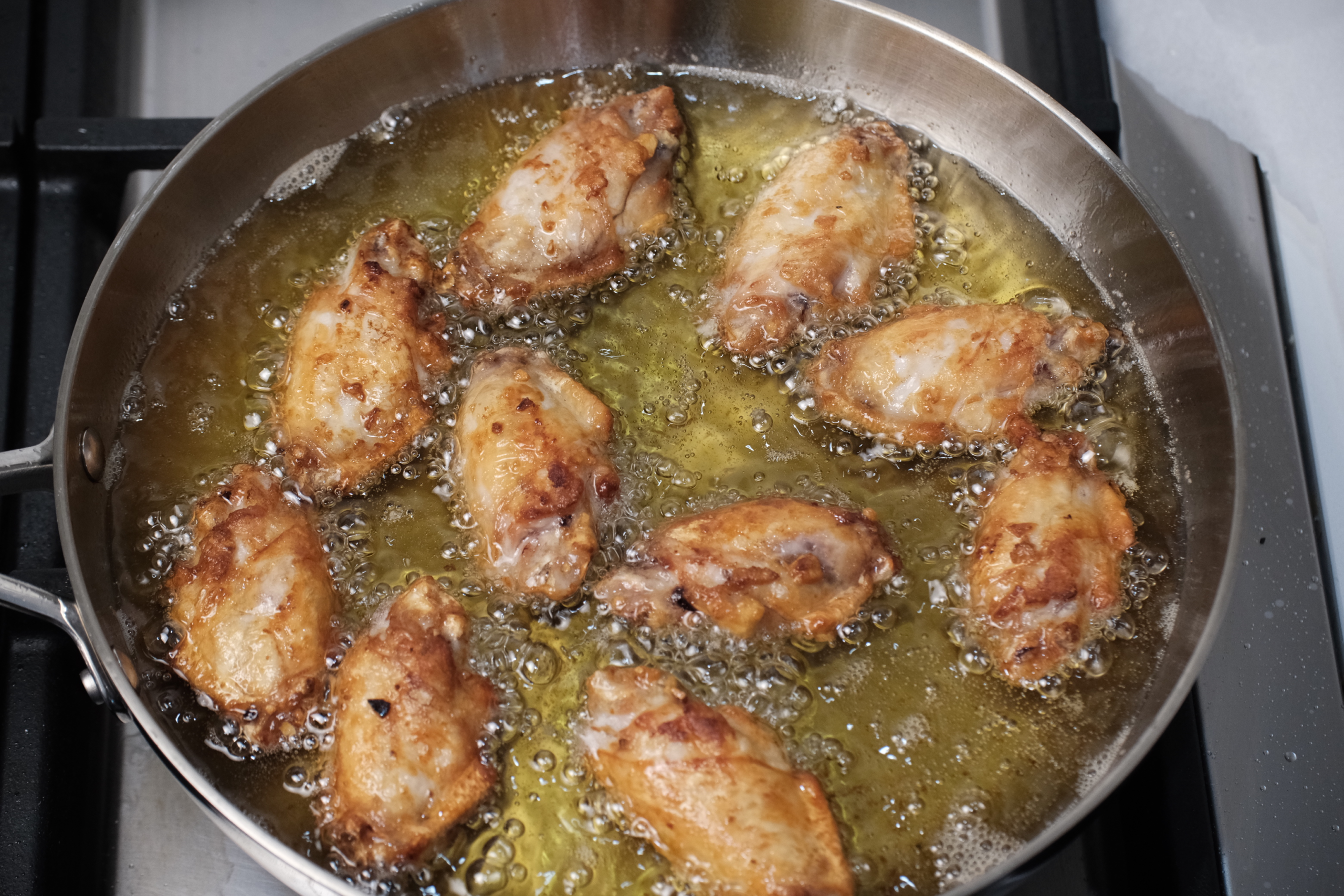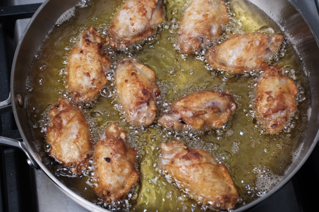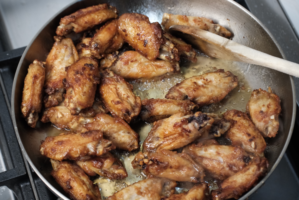 Discard excess oil. Return pan to medium heat with a splash of oil. Add glaze and bring to a bubble. Toss wings to coat.