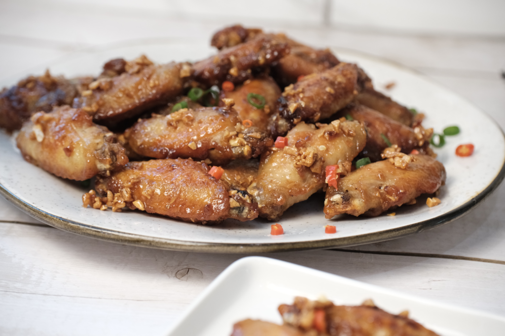 Discard all excess oil from the pan. Return to medium heat. Add a splash of oil and the glaze. Once bubbling, toss the wings to coat evenly. Optional to add slice Thai chilies for heat. Add them directly to the glaze mixture. Let simmer briefly 30-60 seconds with the sauce before tossing in the wings. Sprinkle fried garlic over the wings and toss again. Serve hot