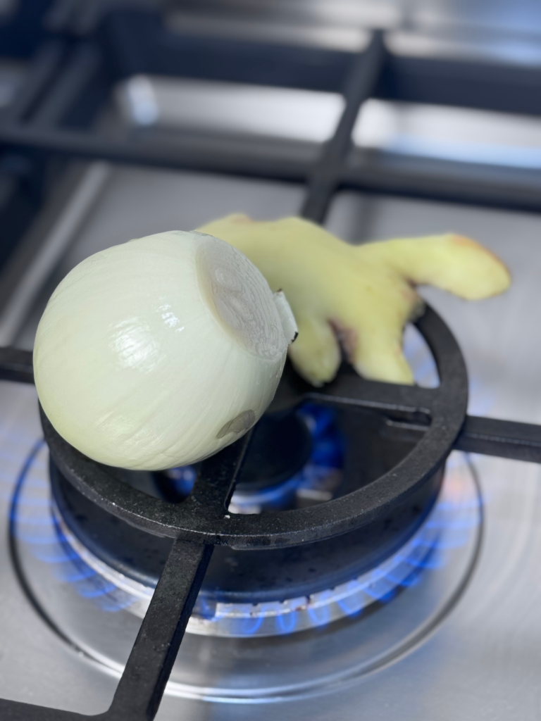 Char your ginger and onion over the stove. Add 6 ½ cups water, the cleaned pork bones, ginger, onion, and peeled daikon to a large pot. Bring to a boil, then reduce to medium-low and simmer for 1 hour, skimming as needed.