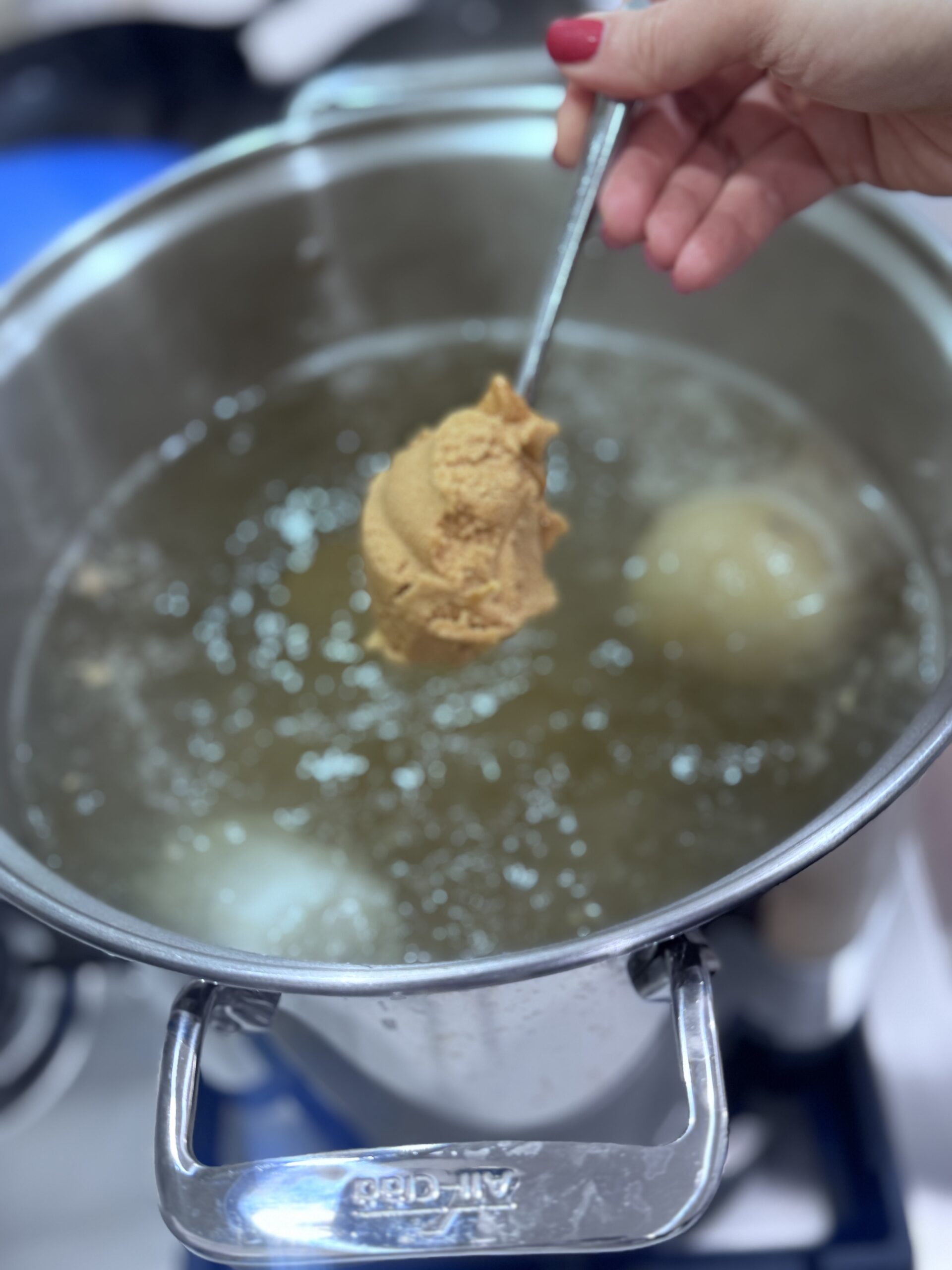 In a separate bowl, dissolve the 3 tablespoons of Quoc Viet Wonton Soup Base in ½ cup of hot broth. Add it back into the pot and simmer for another 30 minutes. Taste and adjust—add more water if too salty, more base if too bland.