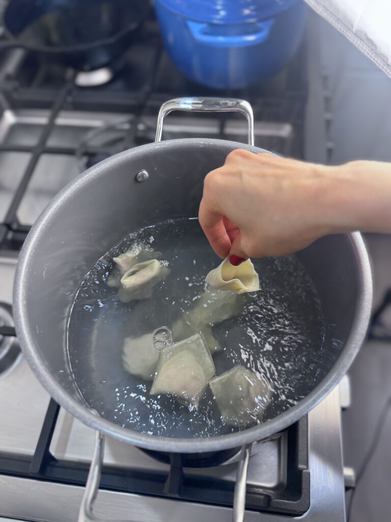 Bring a large pot of water to a boil. Add the wontons and cook for 2 minutes, then remove and place in ice water. Place the wontons in a colander to drain.