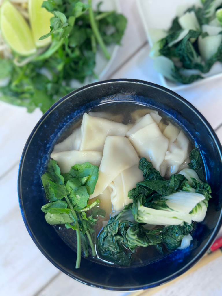 Cook noodles according to package instructions. Add a nest of noodles to each bowl, top with 3–4 wontons, and ladle in hot broth. Garnish with fresh herbs, lime wedges, sprouts, and chiles.
